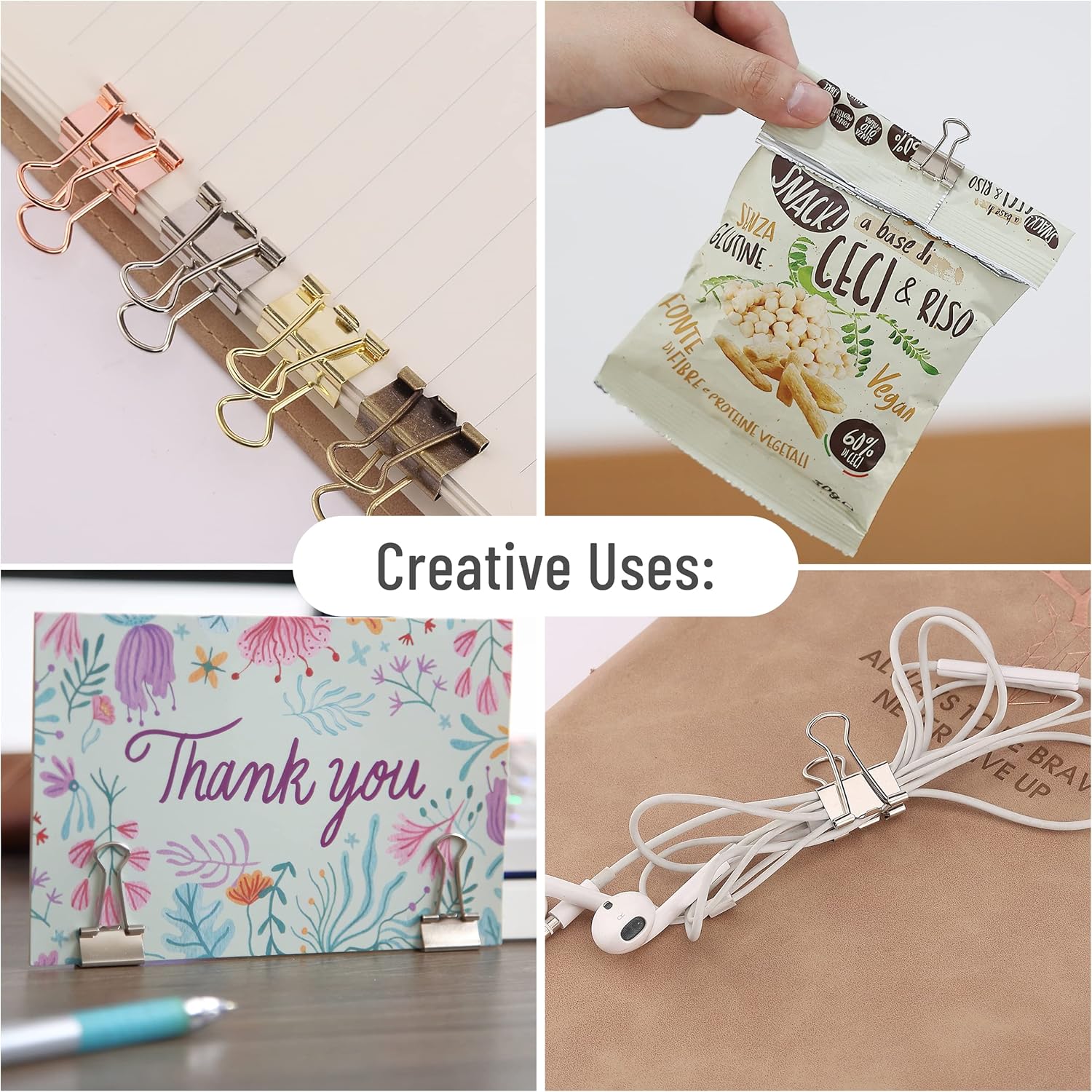- Our small binder clips are perfect for everyday use in the office, at home, or at school. The clips can be used to hold together papers, photos, and more. They can also be used as cable holders, bookmarkers, business card holders, and envelope clips.