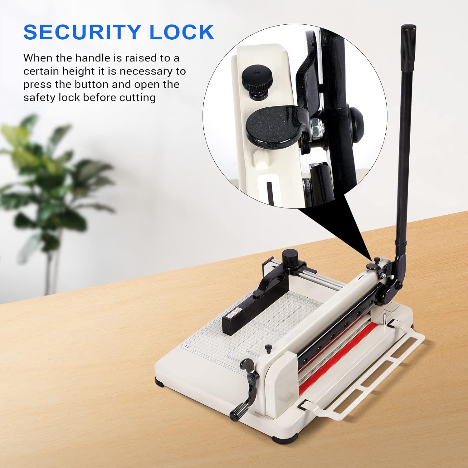- ★【Security Lock & Cradle】:The security lock on the paper cutter for cardstock can reduce operators' harm by accidents. The multifunctional bracket can support the right part of papers, which makes the paper cutting more convenient.