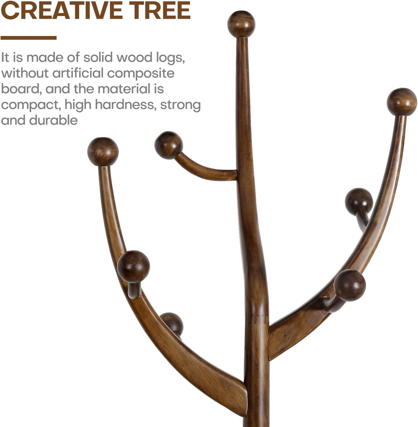 - 【Premium Material】: This coat rack freestanding is made from high-quality rubber wood logs, and does not contain artificial synthetic boards. The wood material exhibits an attractive grain and a walnut brown finish that makes this coat rack a lovely addition to any home