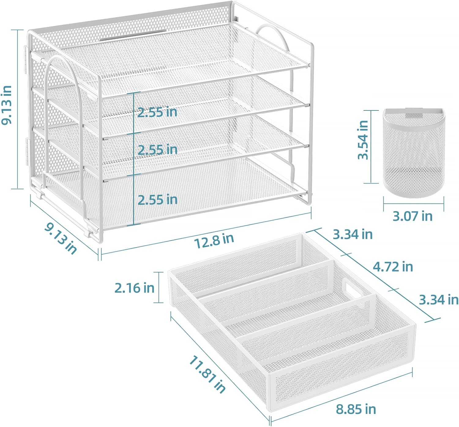 Marbrasse Desk Organizer and Accessories4-Tier Paper File Letter Tray Accessories & Workspace Desk Organizers with Drawer and 2 Pen Holders for School Home Office Supplies (White)
