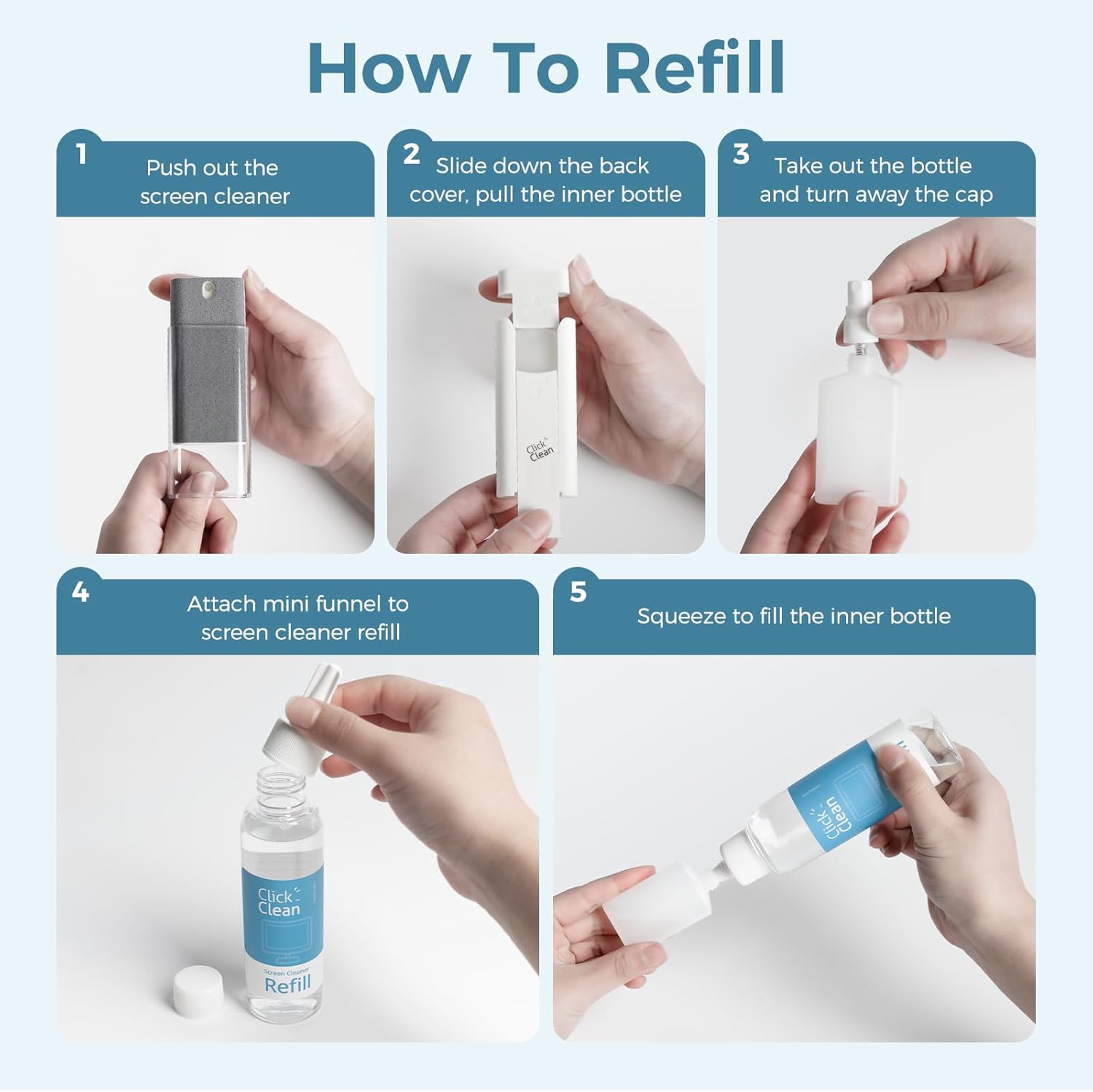 - ALL-IN-ONE MULTIFUNCTIONAL CLEANER KIT- In addition to the 2 screen cleaners included, you get one 4oz bottle of refill, 1 microfiber cloth, 1 mini funnel (built-in), and a sprayer. The refill extends the product's life; the mini funnel helps you refill the cleaner; the sprayer mounts to the refill spout, and the fibre cloth is a new product.