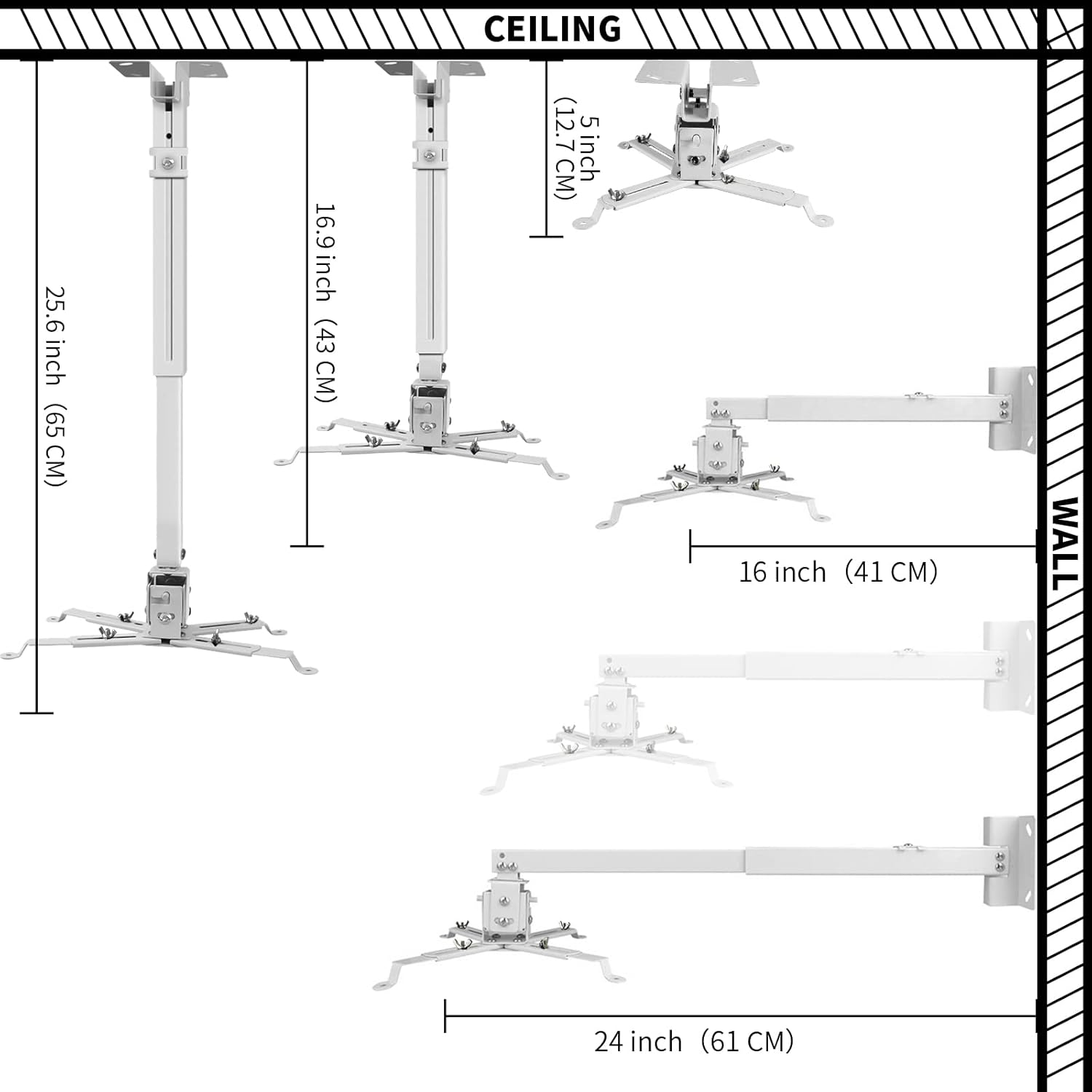 - 【EASY TO ADJUST】The projector holder is fully adjustable with +/- 30 degree tilt, +/-30 degree swivel, hitting all the right viewing angles. The projector ceiling mount adjustable height extends from 16.9" to 25.6" from the ceiling surface and 13.8" to 22.5" from the wall. Flush ceiling mount with a minimum length of 5 inches.