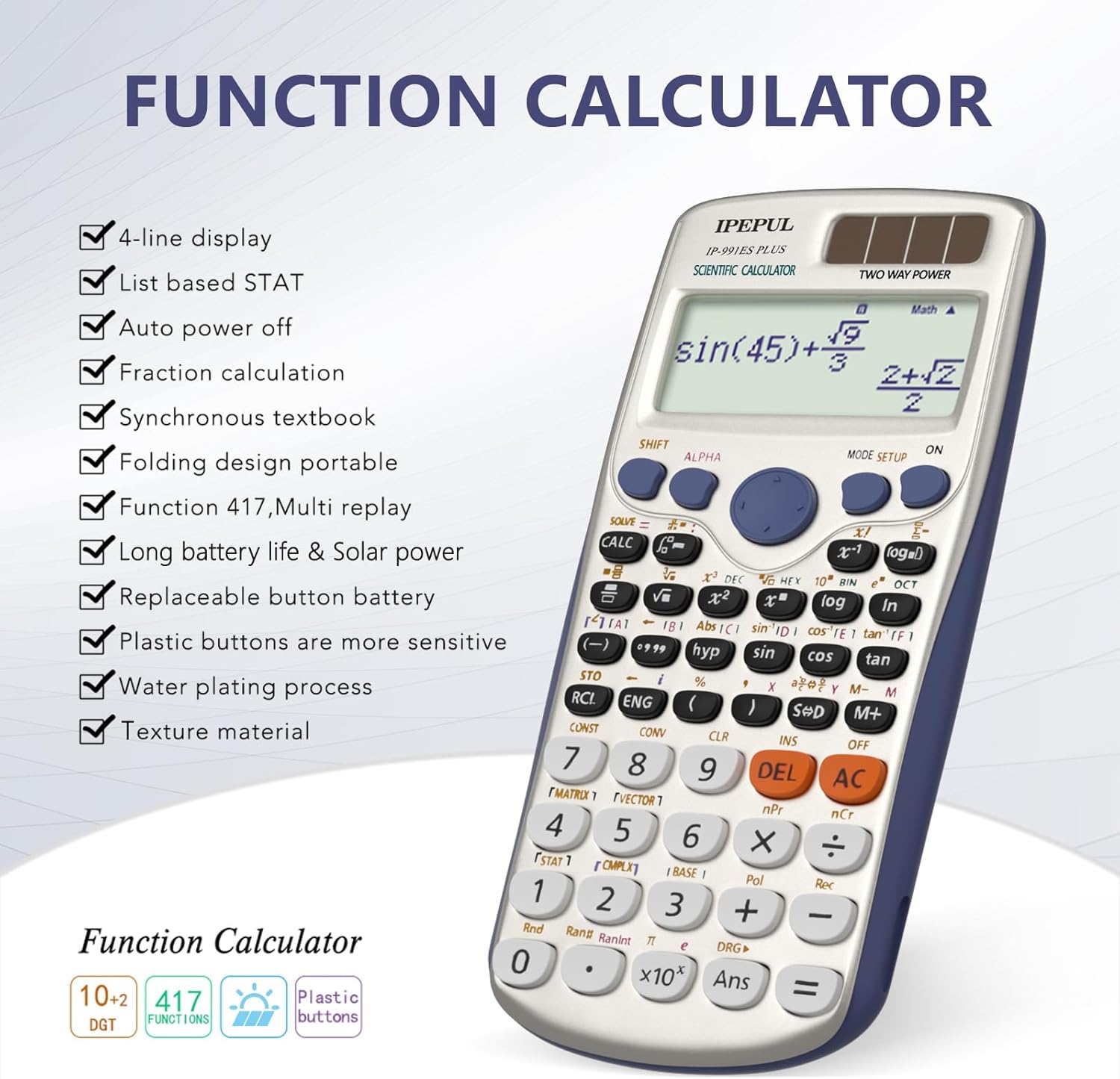 Scientific Calculators, IPepul Math Calculator with 417 Function, Solar Battery Power and 4-Line Display, School Supplies for Middle High College Students Teachers(991ES Plus)