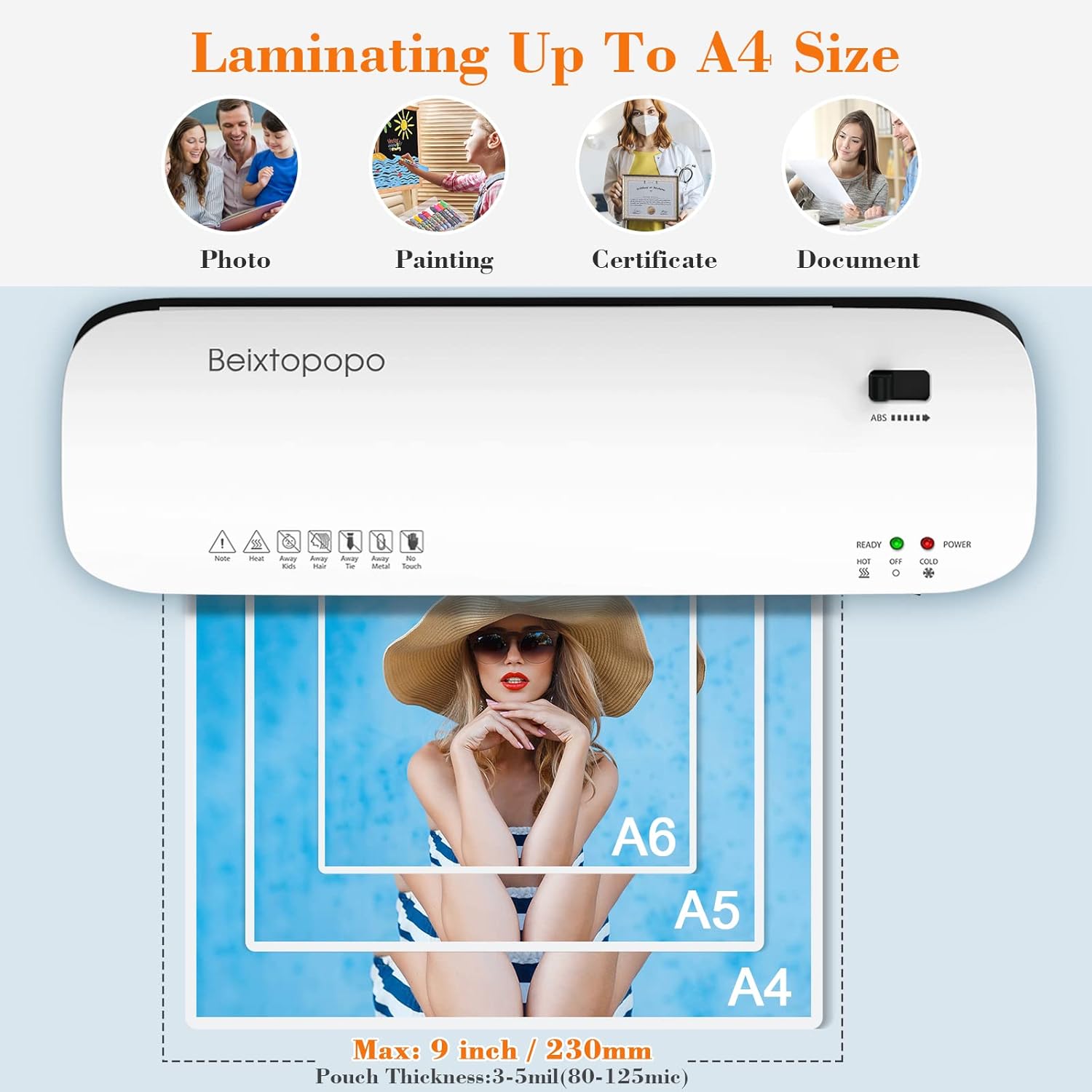Laminator Machine, 9 Inch Thermal Laminater, Beixtopopo A4/A5/A6 Personal Laminator Machine with Laminating Sheets, 6 in 1 Heating Laminate Machine for Home School Office, Silent