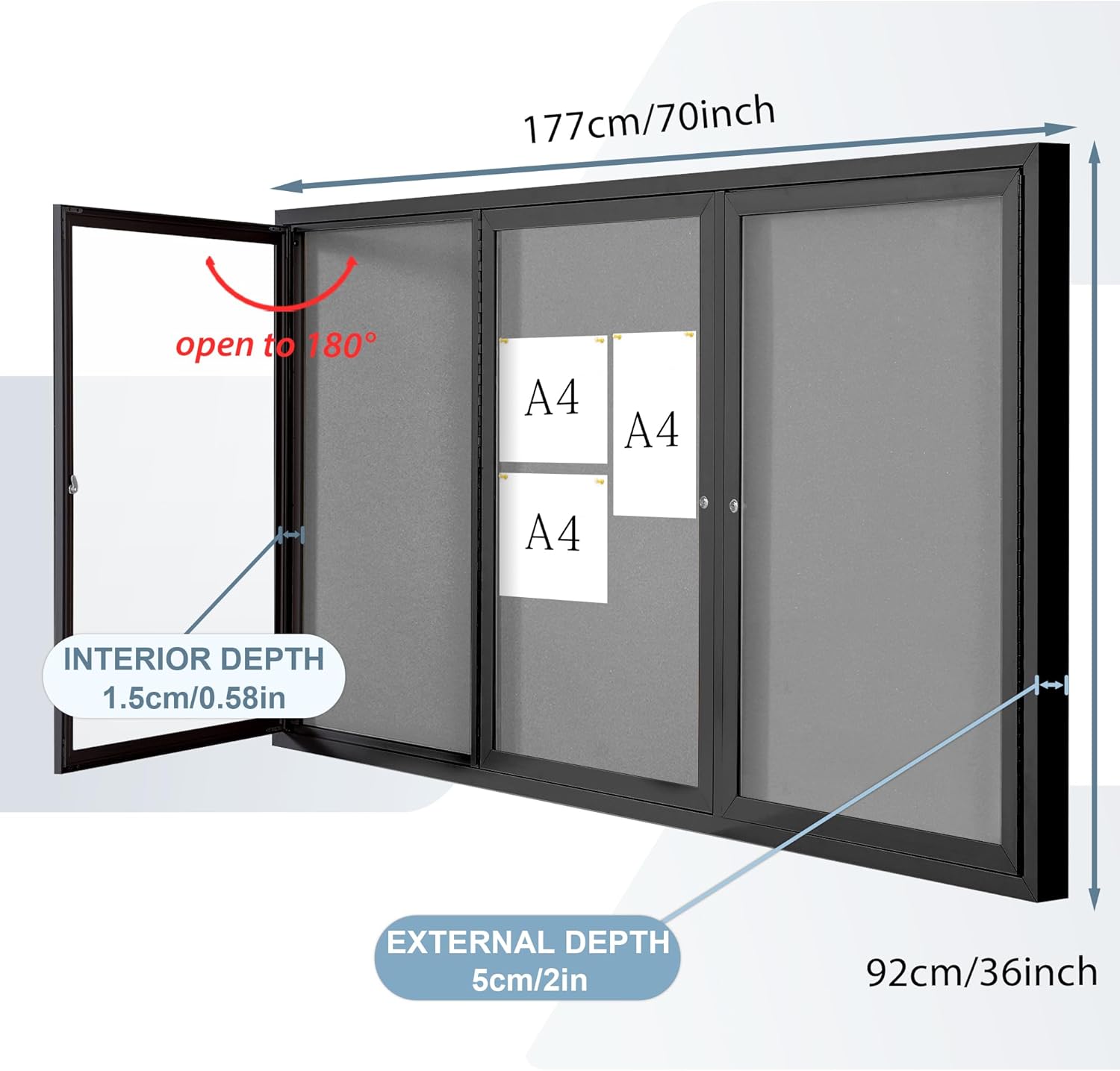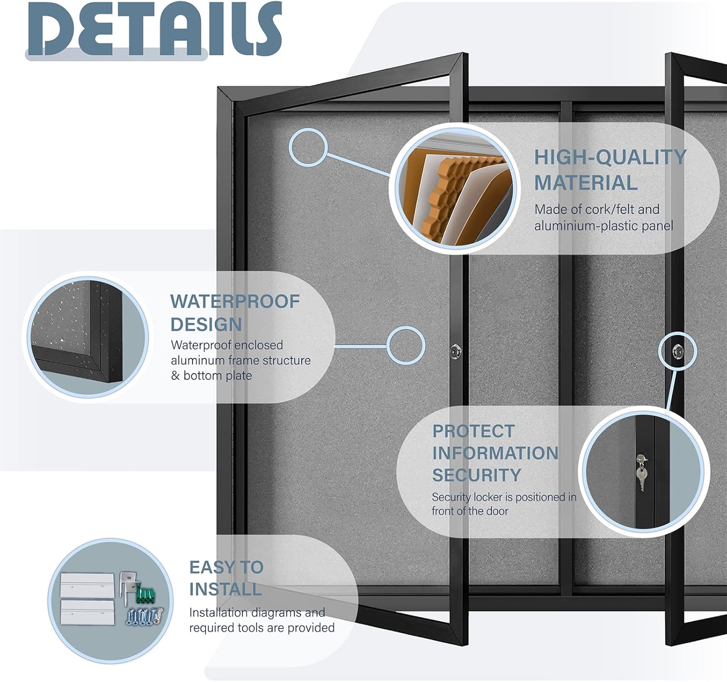 - HIGH-QUALITY MATERIAL:It is made of grey felt pin board, waterproof aluminum construction, shatter-resistant acrylic door and aluminium-plastic panel