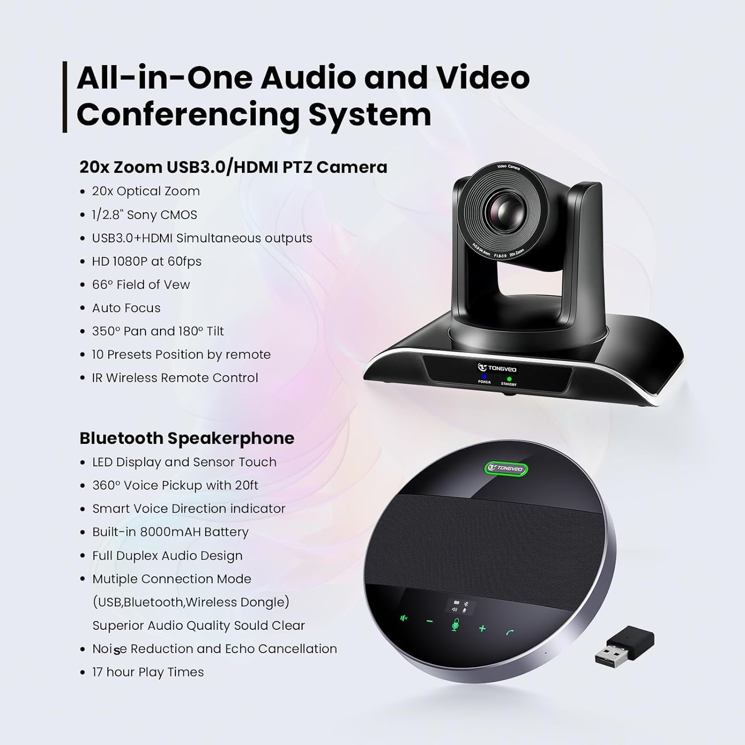 - ✈【20x Zoom Conference room Camera system】TONGVEO All-in-one Conference room camera system consists 20x optical Zoom HDMI PTZ camera and Bluetooth speakerphone, Perfectly combination of the USB HDMI camera and Conference Speaker function, this bundle is conference camera with USB and HDMI interface to connect your laptop PC or Smart TV, then the Conference microphone and HD conference camera can simultaneously work, 20x Zoom camera see farther, and the upgrade speakerphone hear more clearly