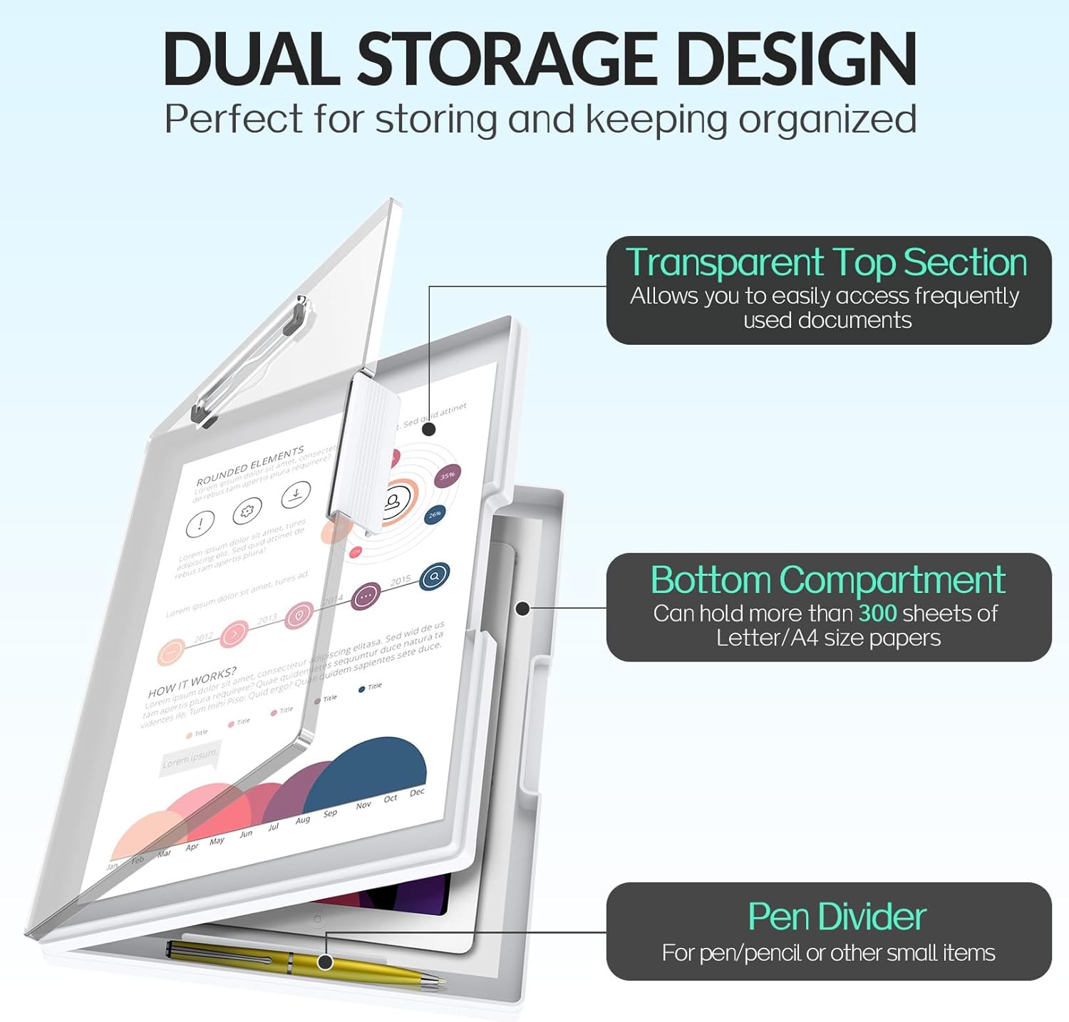 - Dual Storage Compartment: Dual-Layer design ensure roomy space for various needs of storage. Keep frequently used documents on the top compartment and store more than 300 letter-sized /A4 sheets in the spacious bottom compartment