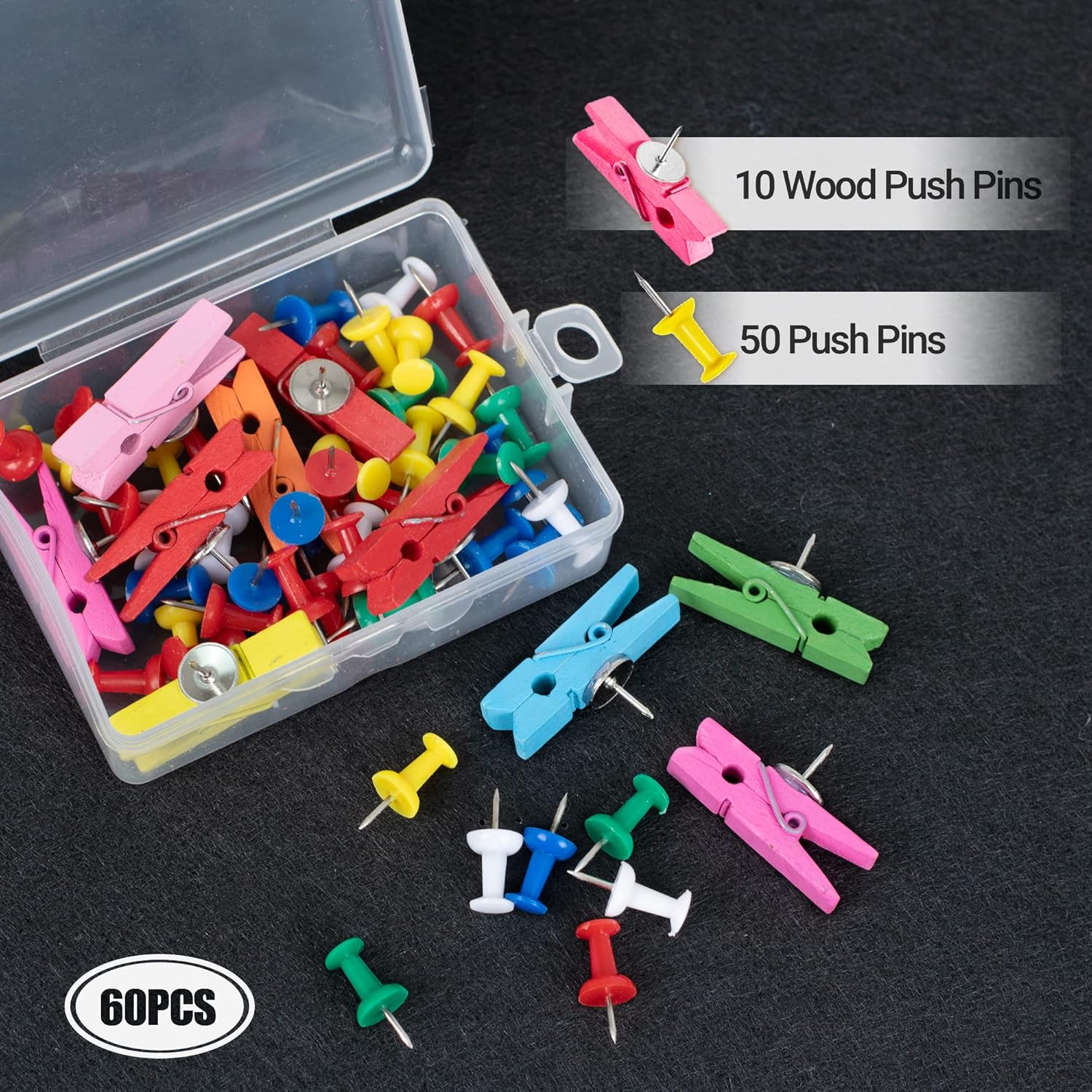 - Corkboard Set: 10 natural wood clips, beautiful and practical, hold more than 30 sheets of office A4 paper; 50 color pins, sturdy and durable, pin important papers and messages to cork boards; 1 plastic box, orderly placement of small parts