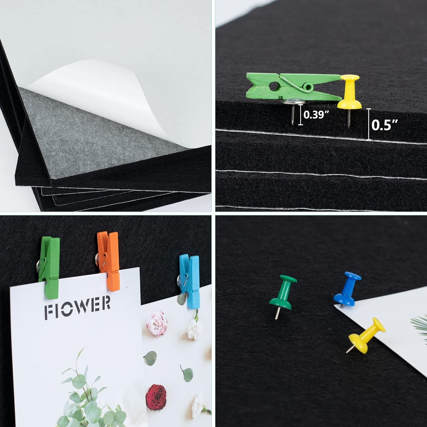AKTOP Cork Board Bulletin Board 12x12, 1/2" Thick Felt Cork Board Tiles 6 Pack, Small Square Pin Board for Wall, Self Adhesive Corkboards with 60 Push Pin Wood Clips for School, Home & Office, Black