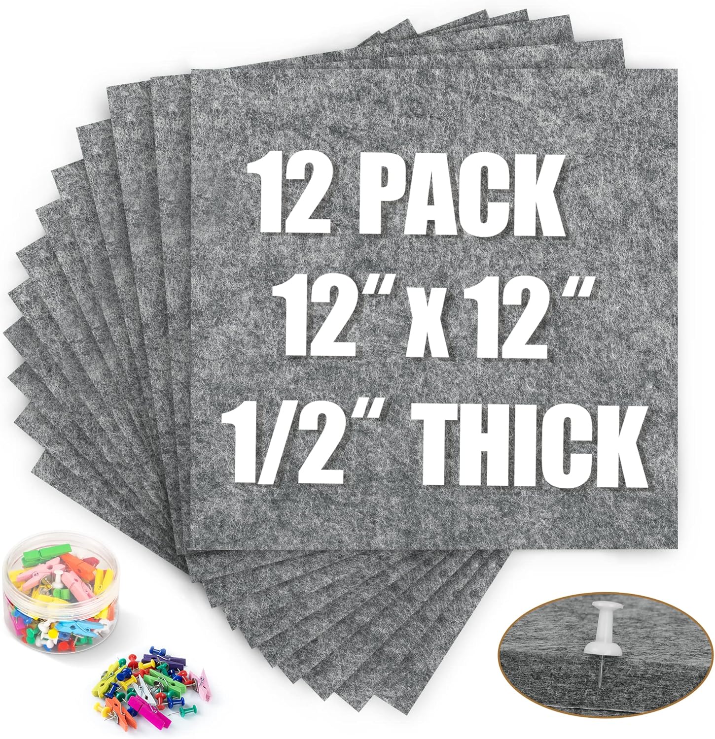 AKTOP Cork Bulletin Board 12x12, 1/2" Thick Felt Cork Board Tiles 12 Pack, Small Square Pin Board for Wall, Self Adhesive Corkboards with 120 Push Pin Wood Clips for School, Home & Office, Grey