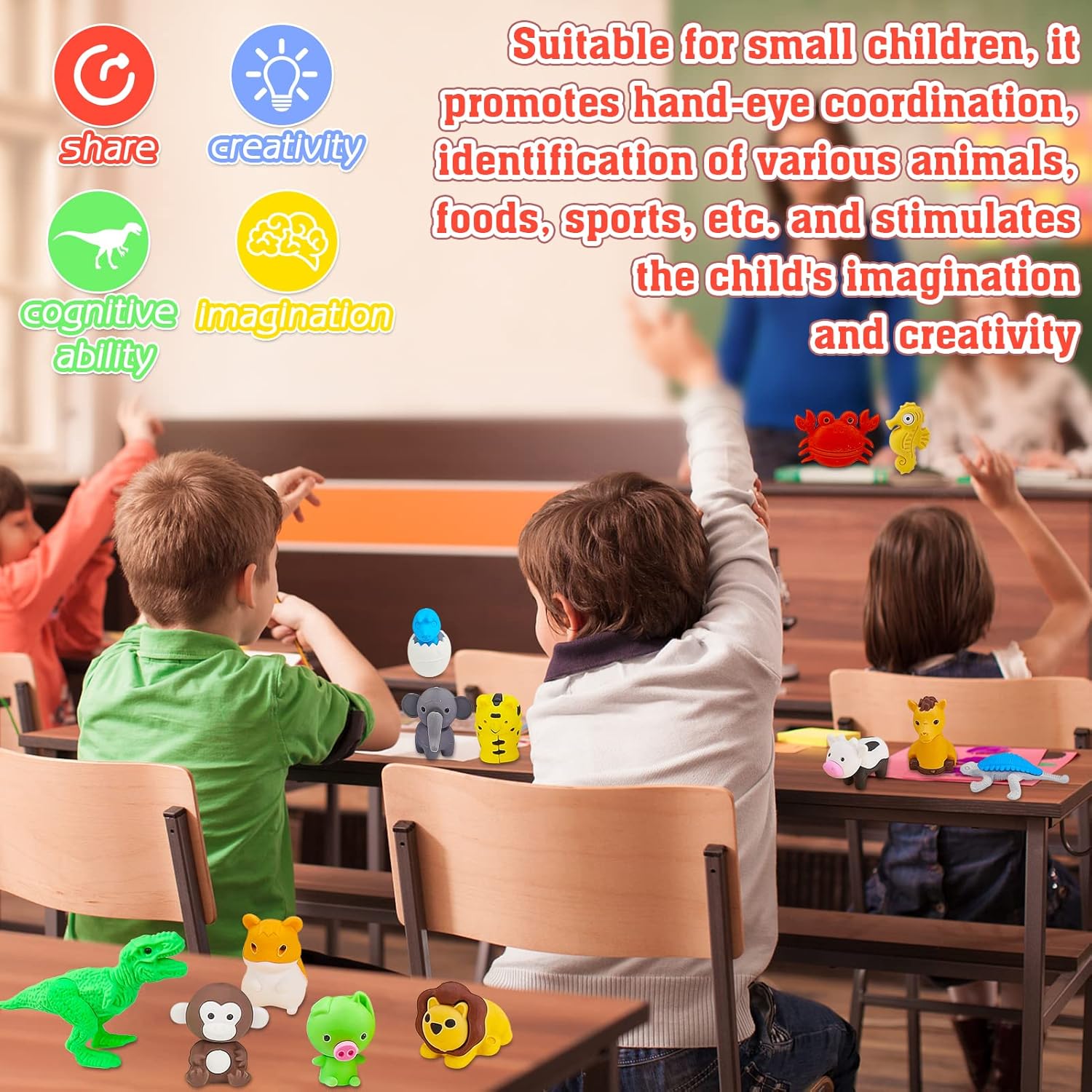 - FUNNY EDUCATIONAL TOY]: Kids animal pencil erasers with different shape and vibrant random colors, promote cognitive development. Through exchange erasers, kids can make new friends, bring peer's pleasure. Small toys improve hand-eye coordination, imagination and creativity. Good toys for little hands to sort, count, and play with.And it is safe for children over 3 years old