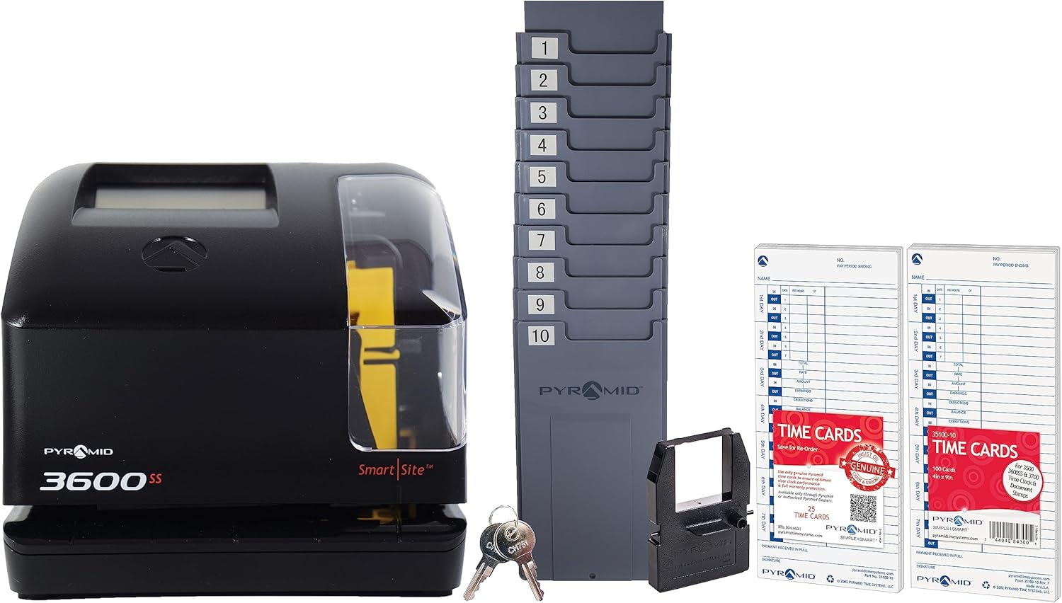 Pyramid Time Systems - 3600SSK1 Smart SiteTime Clock and Document Stamp with SmartSite LED Alignment and Tri-View Window - Includes 125 Time Cards, Time Card Rack, Ribbon, 2 Security Keys