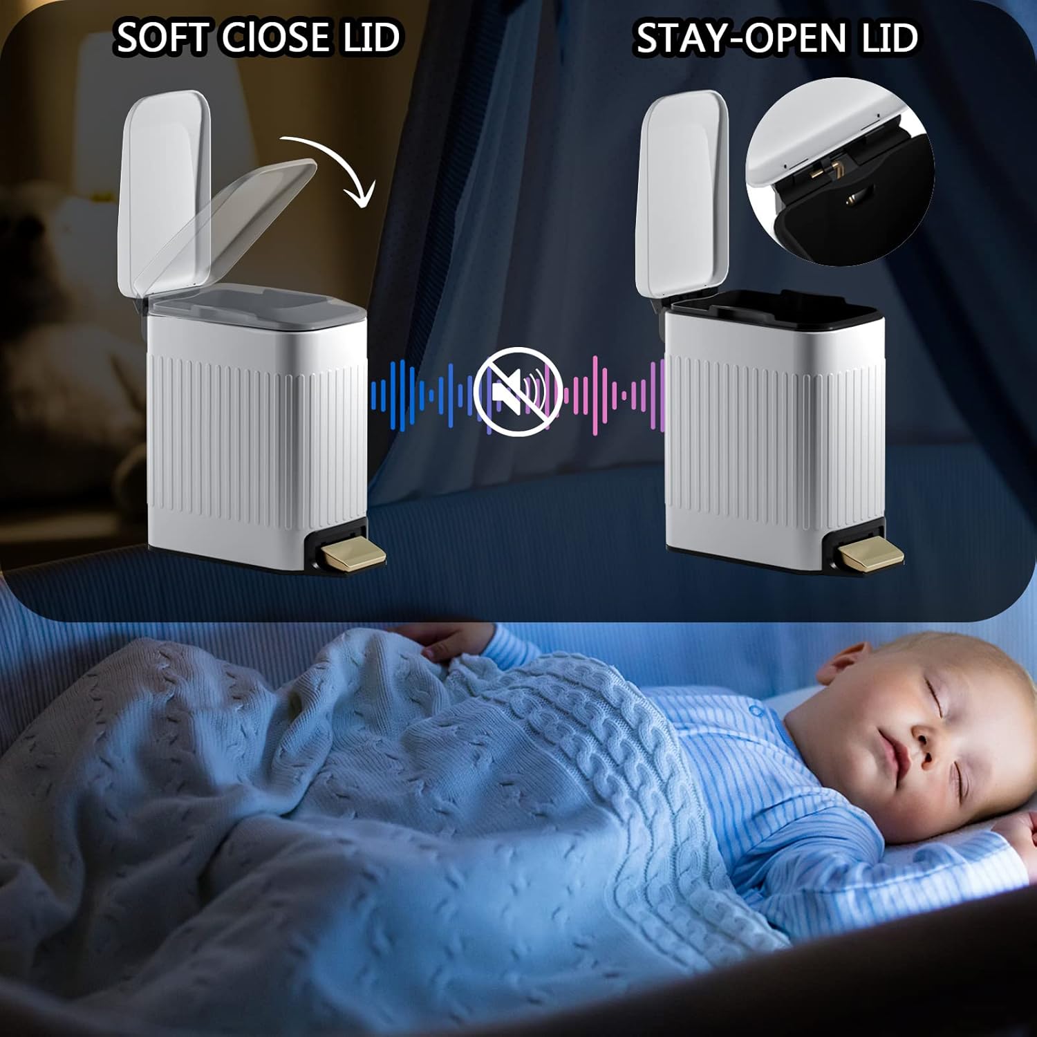 - Silent Soft Close & Stay Open Lid: Stainless Steel trash can, the lid will automatically close after you press the pedal to open the lid, very quiet, no loud noise, don’t worry about disturbing the rest of your family; Push the lid up by hand to hold the lid at 90°to keep it open