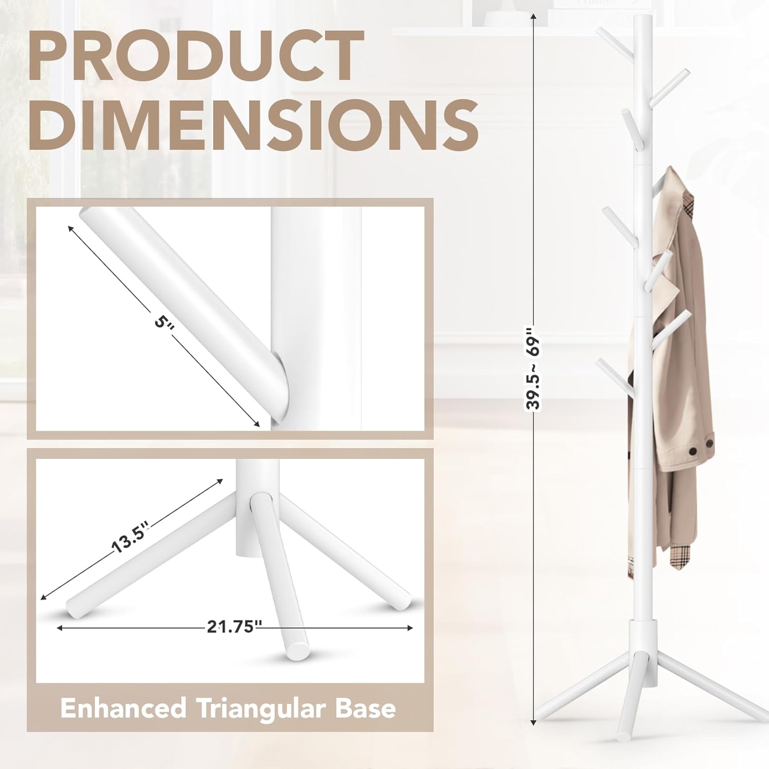 - Adjustable Height: It features a four-segment design with three height options: 39.5", 54.2", 69". You can customize the height and hook of the coat rack according to your preference. Suitable for children, youth and adults, free to adjust as needed
