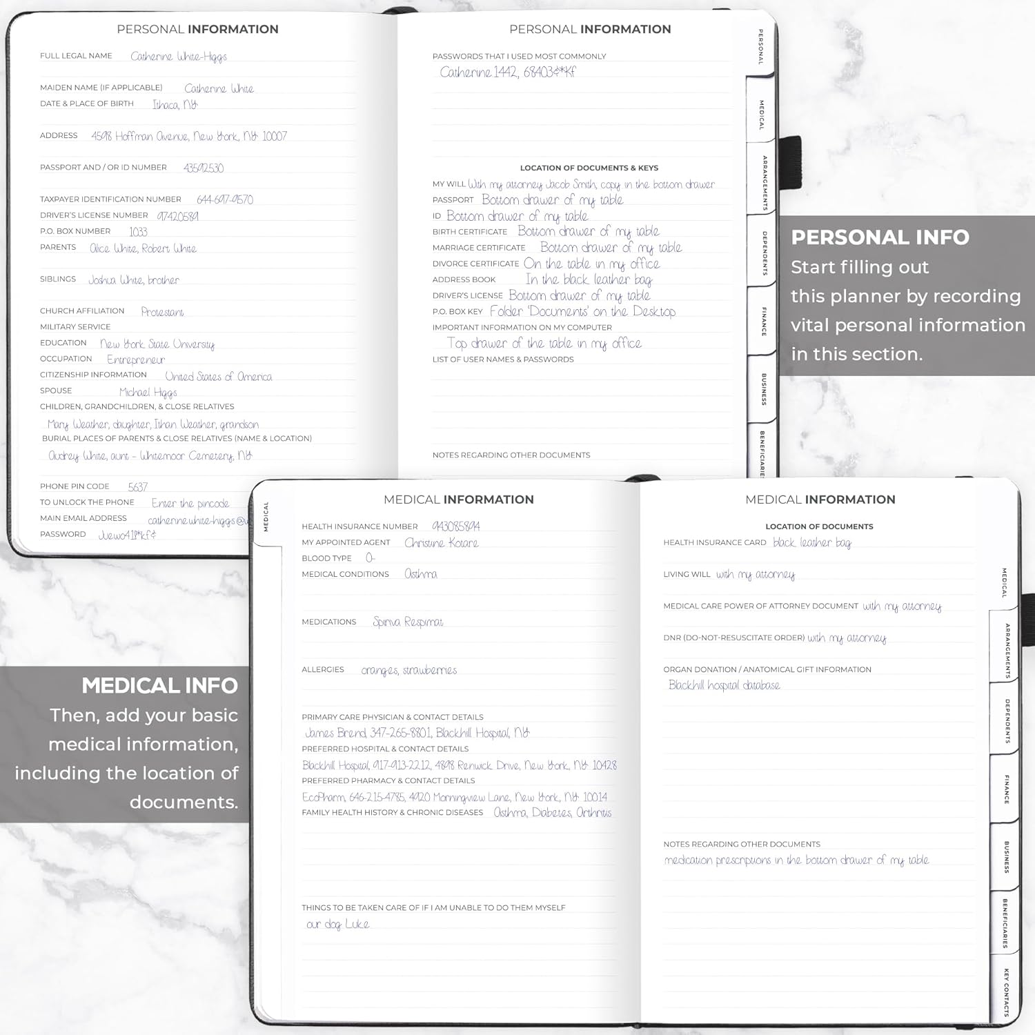 - MEDICAL & FINANCIAL INFO, INSURANCE POLICIES, ACTIVE MEMBERSHIPS & MORE: Inside this funeral planning workbook, you can add care instructions for dependents and pets, personal property, finance & business info, insurance policies, beneficiaries, and more.