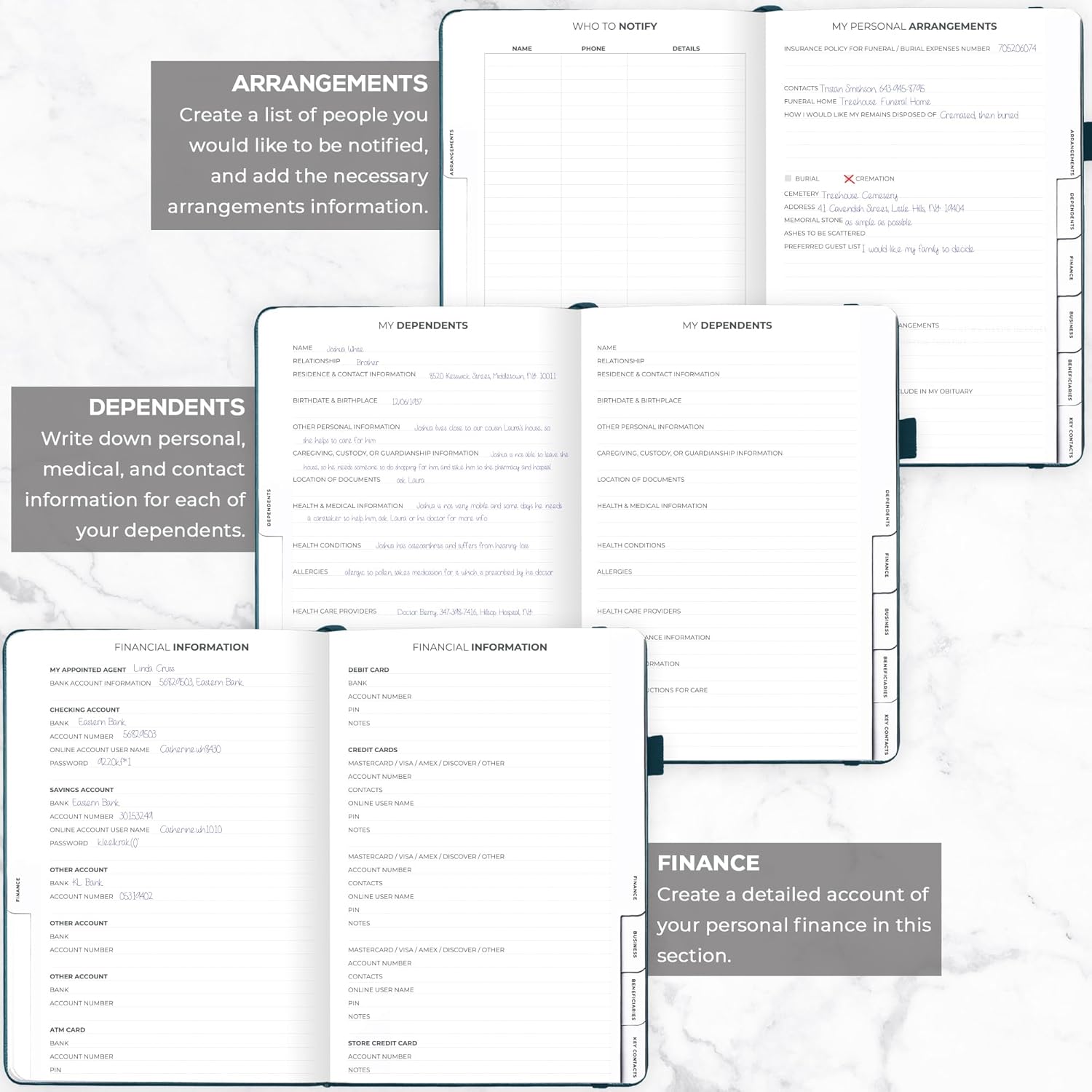- PREPARE DETAILED INSTRUCTIONS TO GUIDE YOUR LOVED ONES: This guided final arrangements planner is an easy-to-use tool for organizing all essential personal information, from medical data to passwords and financial records.