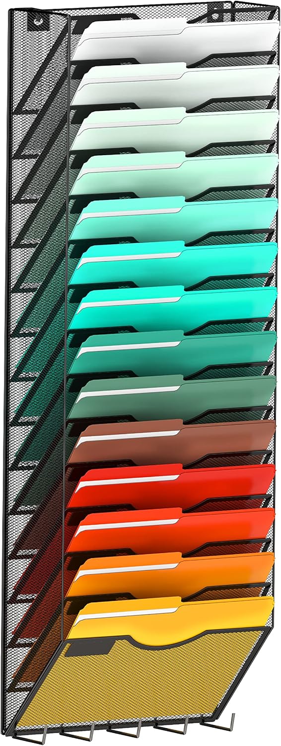 10-Tier Hanging Wall File Organizer Wall Mounted File Holder Document Wall Organizer for Office Organization and School Storage (No Assembly Required) (15 Tier Black)