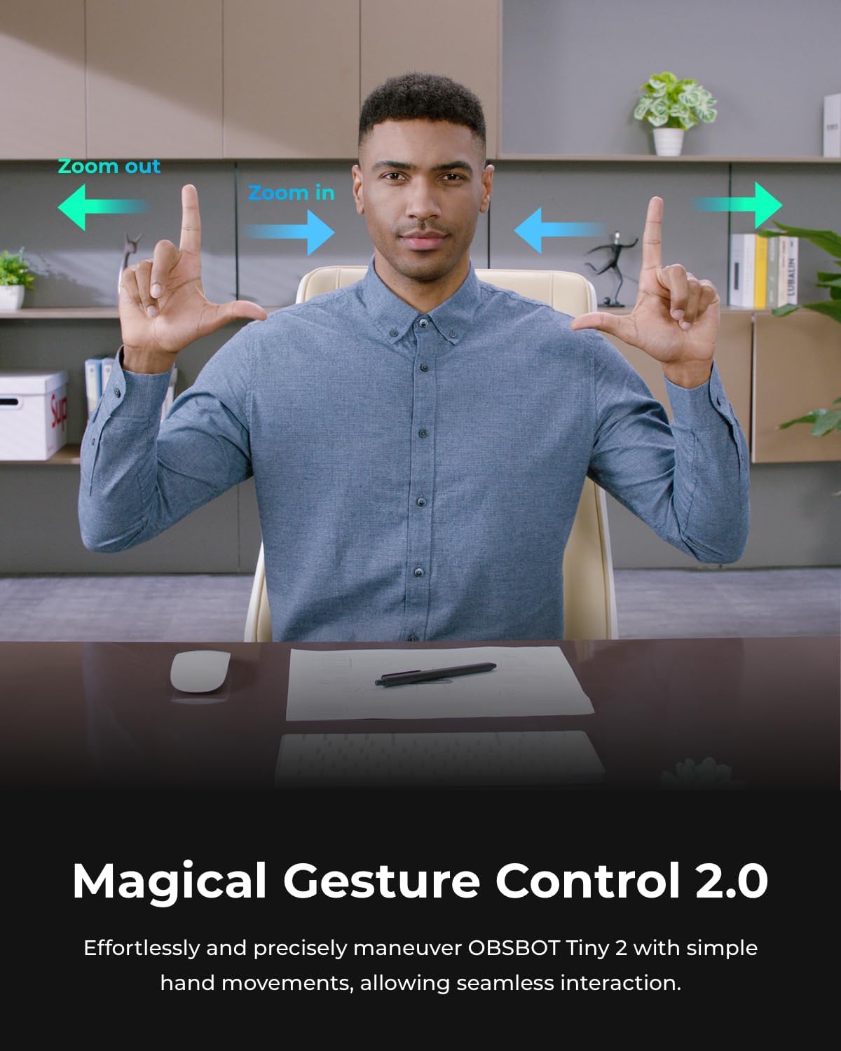 - 【Breakthrough Voice & Gesture Control】Our Webcam with Microphone introduces a groundbreaking voice control feature, becoming the first webcam to support voice commands. If you are far away from the conference camera, you can control your Webcam for Streaming through specific commands, such as 🗣️"Hi, TINY", "Track Me", etc simple command. Besides, Tiny 2's gesture control has been upgraded to version 2.0, making it even more responsive.