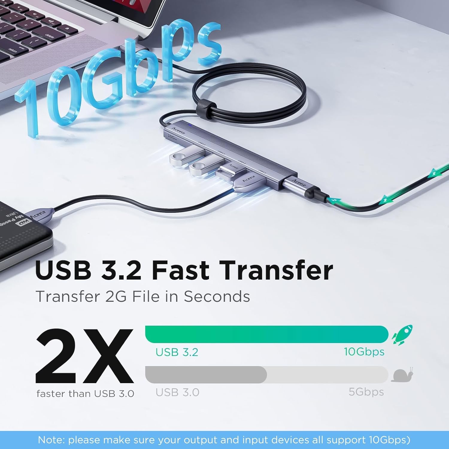 - [10Gbps USB A 3.2 Hub]: Turn one PC's USB port into 4 USB 3.2 hubs with this hub 3.2 Gen 2. The 4 ports share 10Gbps transmission speed (2 times faster than USB 3.0) and transfer large files quickly! (โ๐๐จ๐ญ๐: ๐๐ก๐๐ญ ๐ญ๐ก๐ ๐ญ๐ซ๐๐ง๐ฌ๐ฆ๐ข๐ฌ๐ฌ๐ข๐จ๐ง ๐ฌ๐ฉ๐๐๐ ๐ข๐ฌ ๐ซ๐๐ฅ๐๐ญ๐๐ ๐ญ๐จ ๐ฒ๐จ๐ฎ๐ซ ๐๐๐ฏ๐ข๐๐ ๐๐ง๐ ๐๐๐๐ฅ๐, ๐ฉ๐ฅ๐๐๐ฌ๐ ๐๐ง๐ฌ๐ฎ๐ซ๐ ๐ญ๐ก๐๐ญ ๐๐จ๐ญ๐ก ๐ฒ๐จ๐ฎ๐ซ ๐จ๐ฎ๐ญ๐ฉ๐ฎ๐ญ ๐๐ง๐ ๐ข๐ง๐ฉ๐ฎ๐ญ ๐๐๐ฏ๐ข๐๐๐ฌ ๐ฌ๐ฎ๐ฉ๐ฉ๐จ๐ซ๐ญ ๐๐๐๐๐ฉ๐ฌ๏ผ