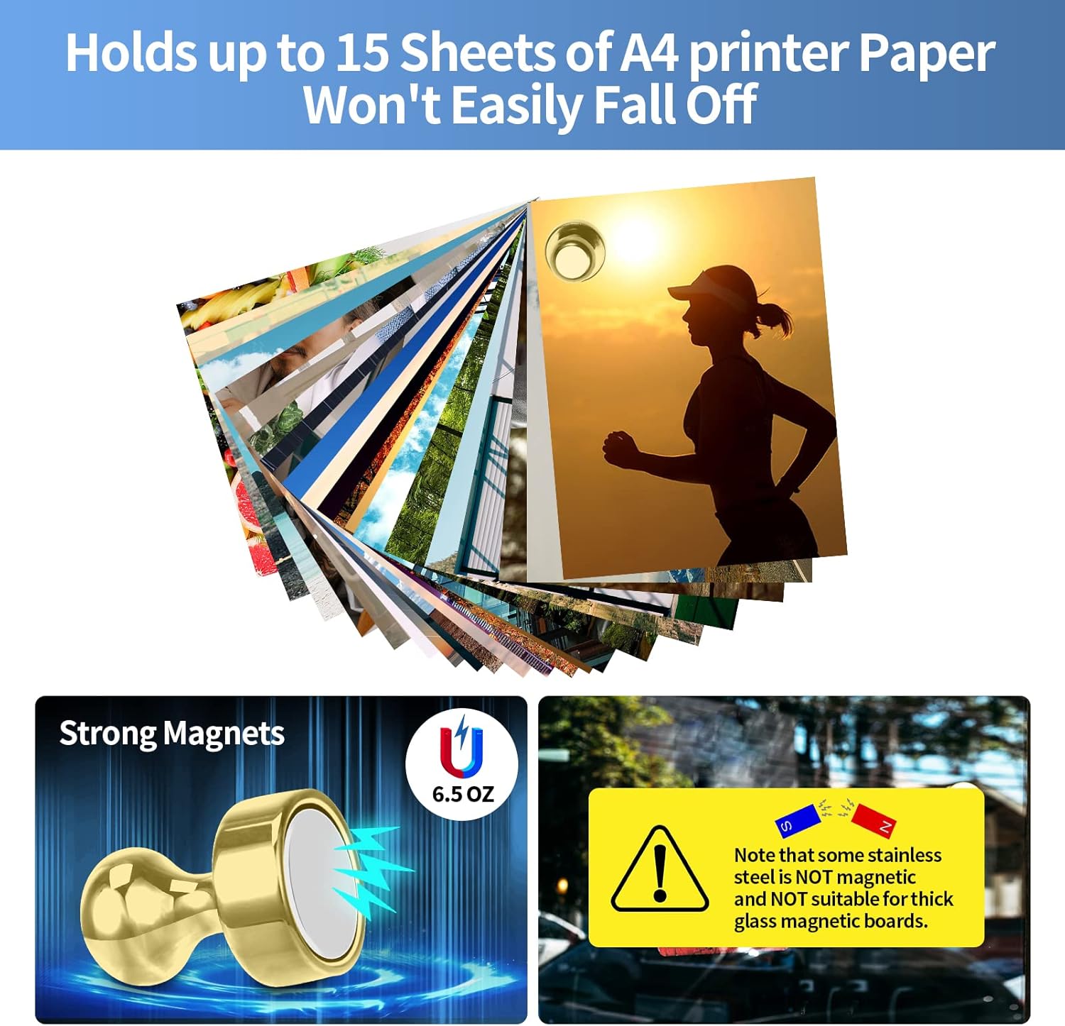 - đ»ăStrong Whiteboard MagnetsăDo not be fooled by these cute fridge magnet set, They can hold up to 15 sheets of A4 printer paper at once with just a tiny magnet. Even possible to use them in the kitchen to hold cooking tools that weigh no more than 6.5 OZ and the cooking tools won't easily fall off.