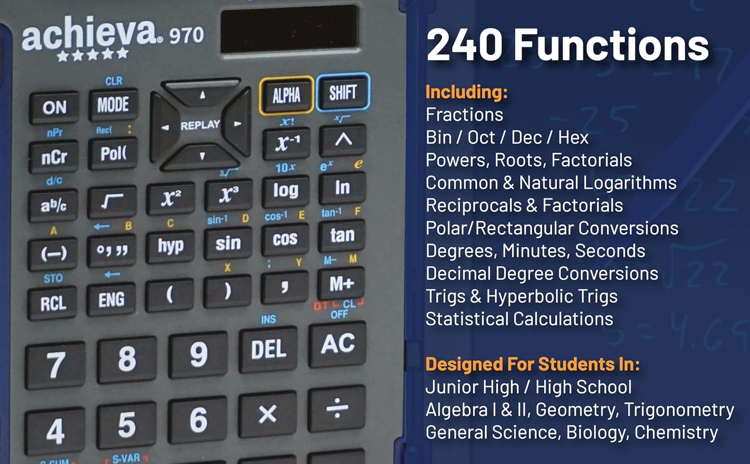 Achieva Scientific Calculator with Erasable LCD Writing Tablet | 2-Line Display | Dual Solar & Battery Power | for Students in Middle School, High School (970)