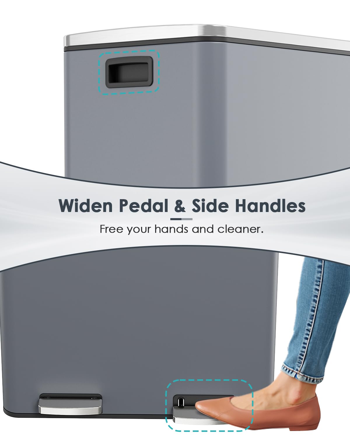 - DUAL TRASH CAN: Trash can has double compartments, which makes it easier for you to separate dry and wet trash. Each compartment has an independent lid to make the trash no smell pollution exists.