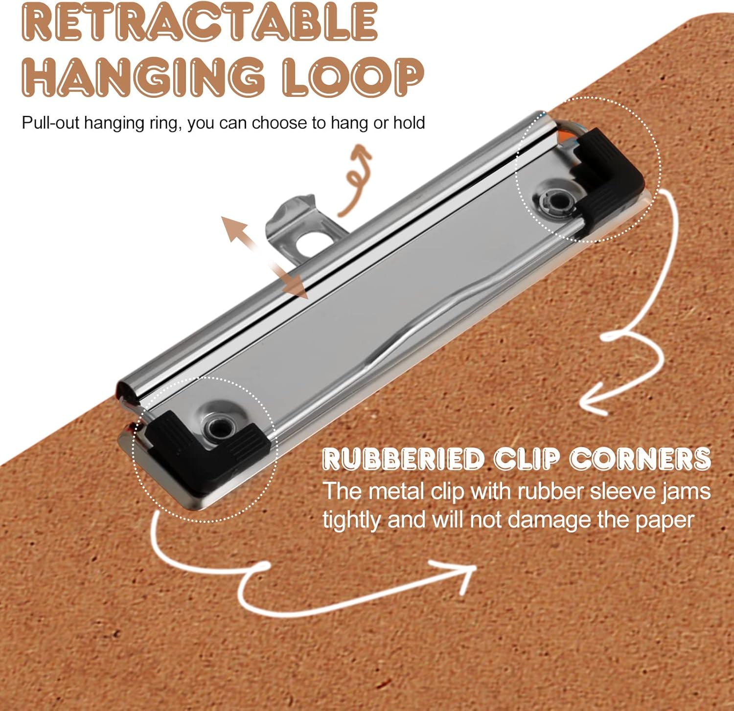 - ā RETRACTABLE HANGING LOOP: The clipboards have a built-in hanging hole, which can help you place your documents randomly. And it can be stowed away when not needed