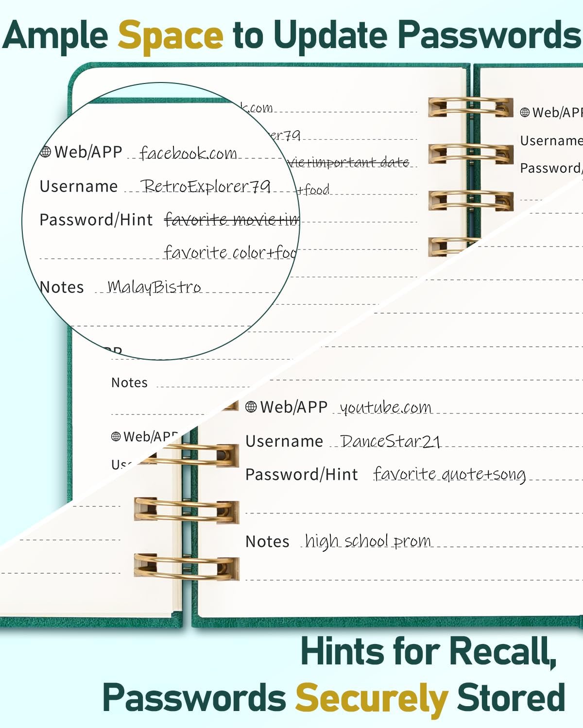 - Never Forget Passwords Again: Record 468 passwords, with space for updates; Say goodbye to password woes! Secure Pass Keeper Book keeps you covered