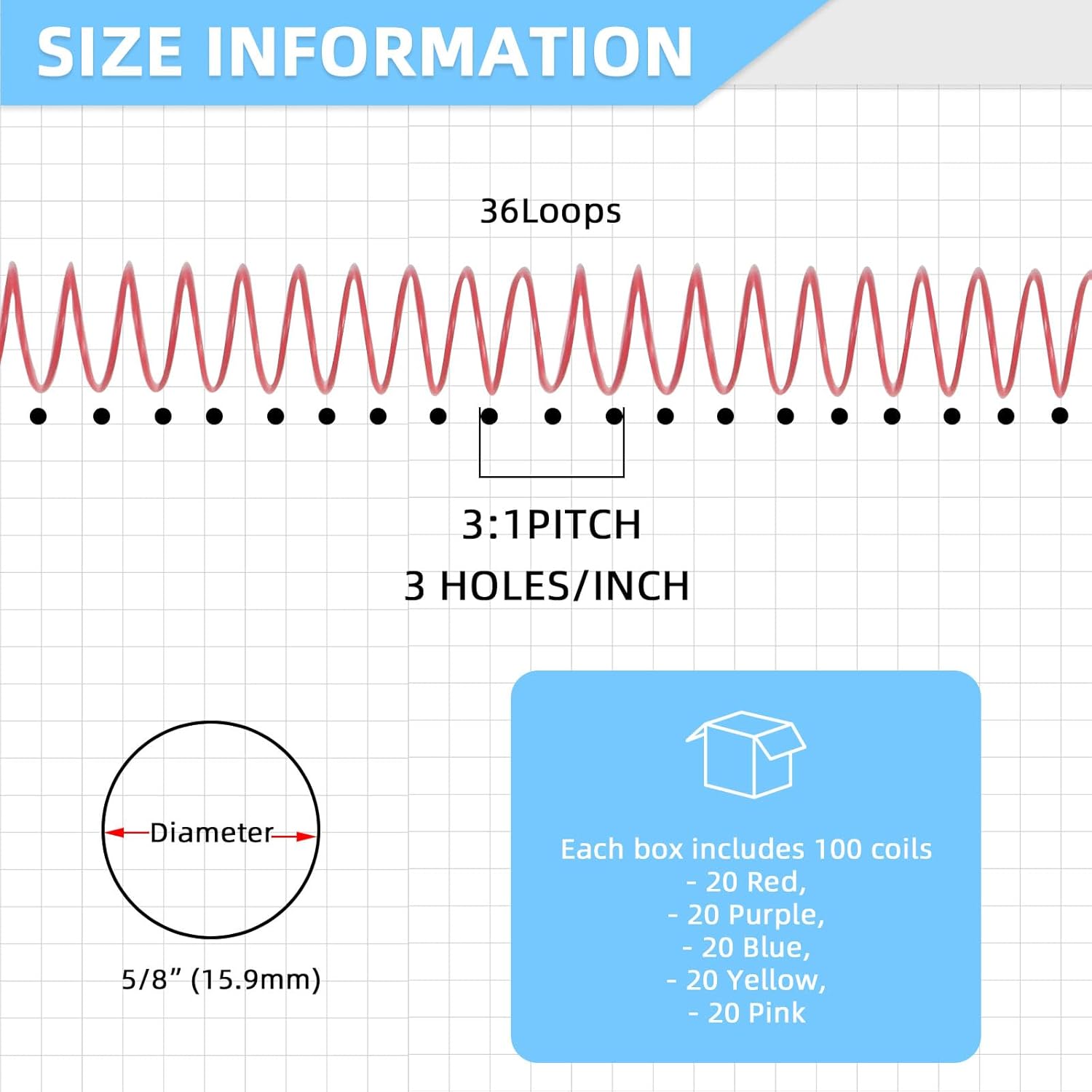 - 【Cost-Effective Pack of 100】Available in multiple colors (Yellow, Blue, Red, Purple, Pink), these coils provide a budget-friendly solution for binding projects at the office, school, or home
