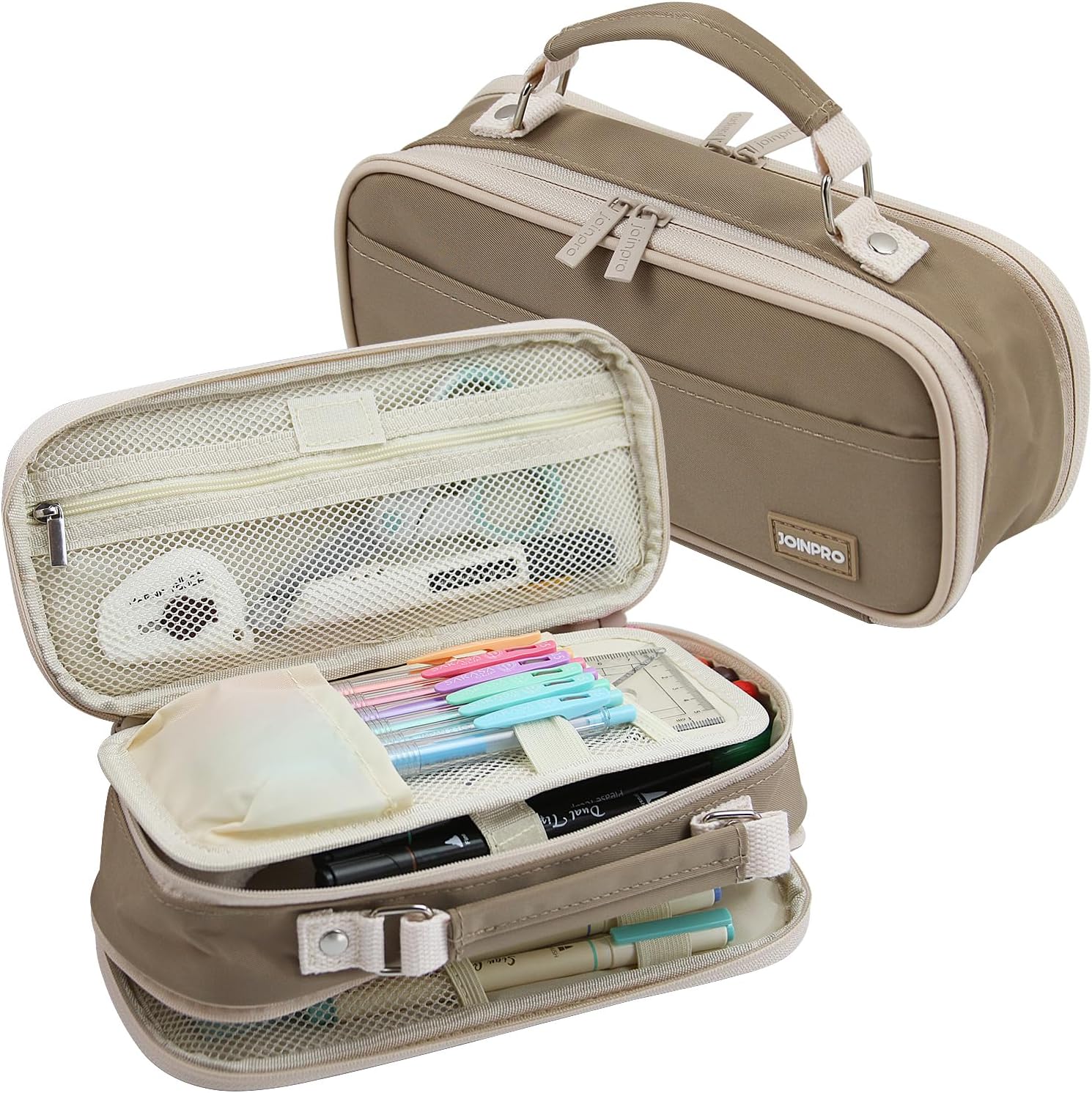 • Unique Designs - Fashionable colors and appearance, with three-dimensional and layered structure design. Two double-zipper, interior mesh pockets, and different compartments are designed for this pencil bag, it can hold pretty much everything a student needs. With rivet reinforcement handle strap design, not easy to break; and thickened handle strap for comfortable use and easy to carry.