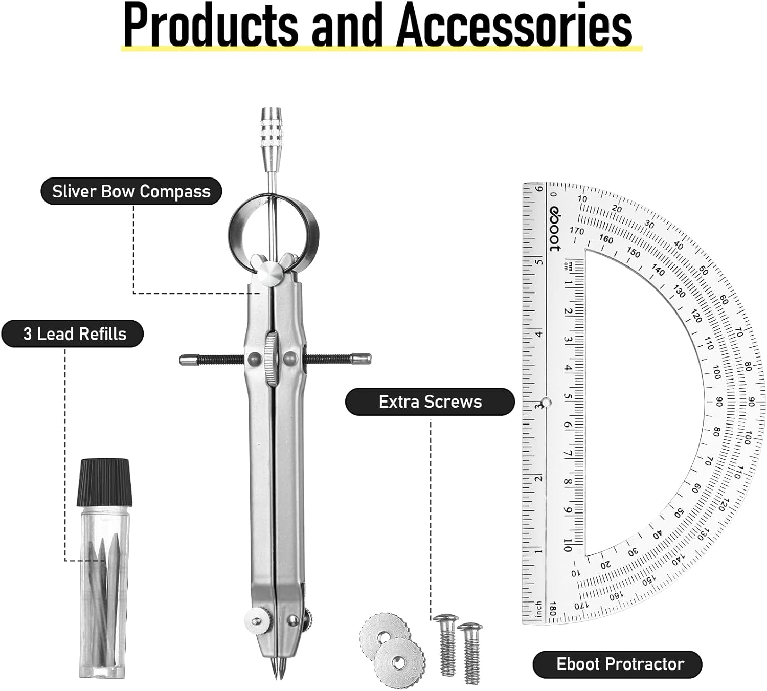 EBOOT Student Geometry Math Set, Drawing Compass and 6 Inch Clear Swing Arm Protractors 180 Degree Math Protractor (Silver)