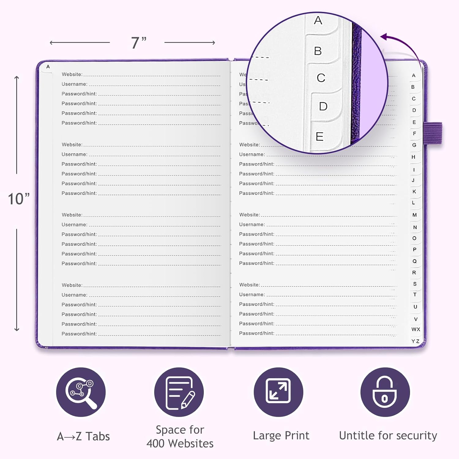 JUBTIC Password Book with Individual Alphabetical Tabs, 7"x10" Internet Password Keeper Book for Seniors, Password Notebook and Organizer/Notes Section,Purple
