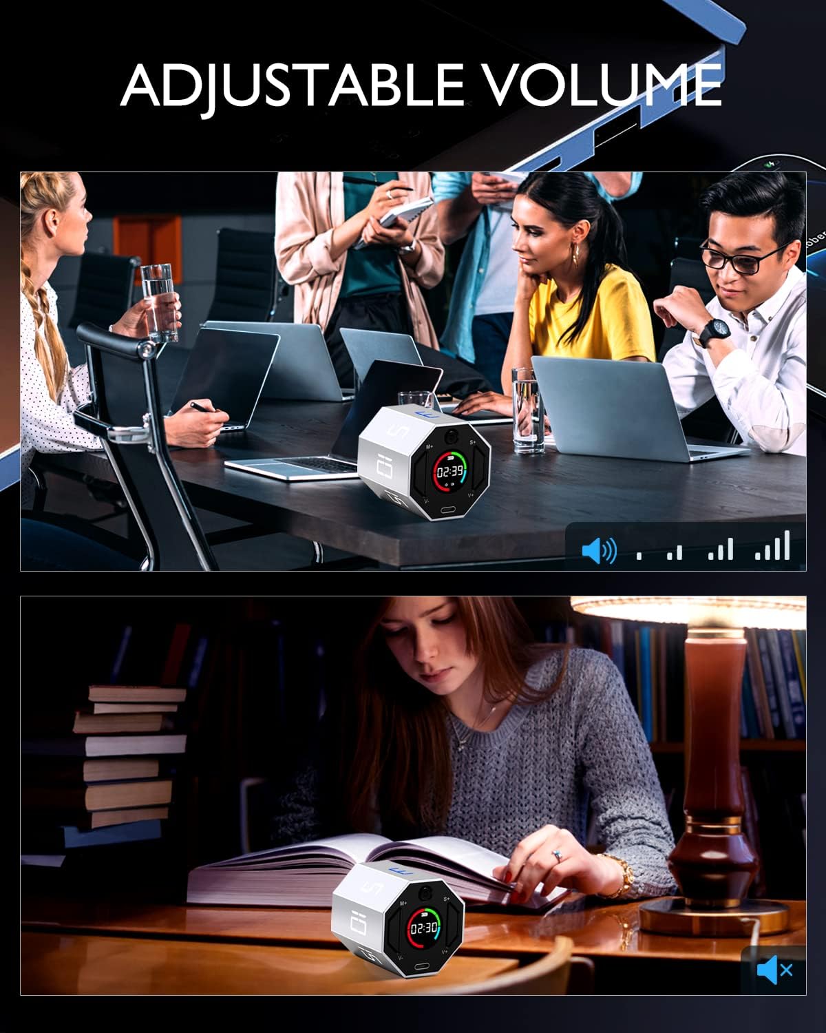 - OCTAGONAL GRAVITY TIMER - FLIP TO SET TIME: [upgrade] Pomodoro timer 2.0 has 8 preset countdowns (3/5/10/15/20/30/45/60 minutes), Just flip up any side of the Pomodoro timer to set your countdown, you can set it with one hand when you are busy. Also supports custom countdown(the maximum time is 99:59) which widely suits your daily study, fitness yoga, work meetings, kitchen cooking, etc.