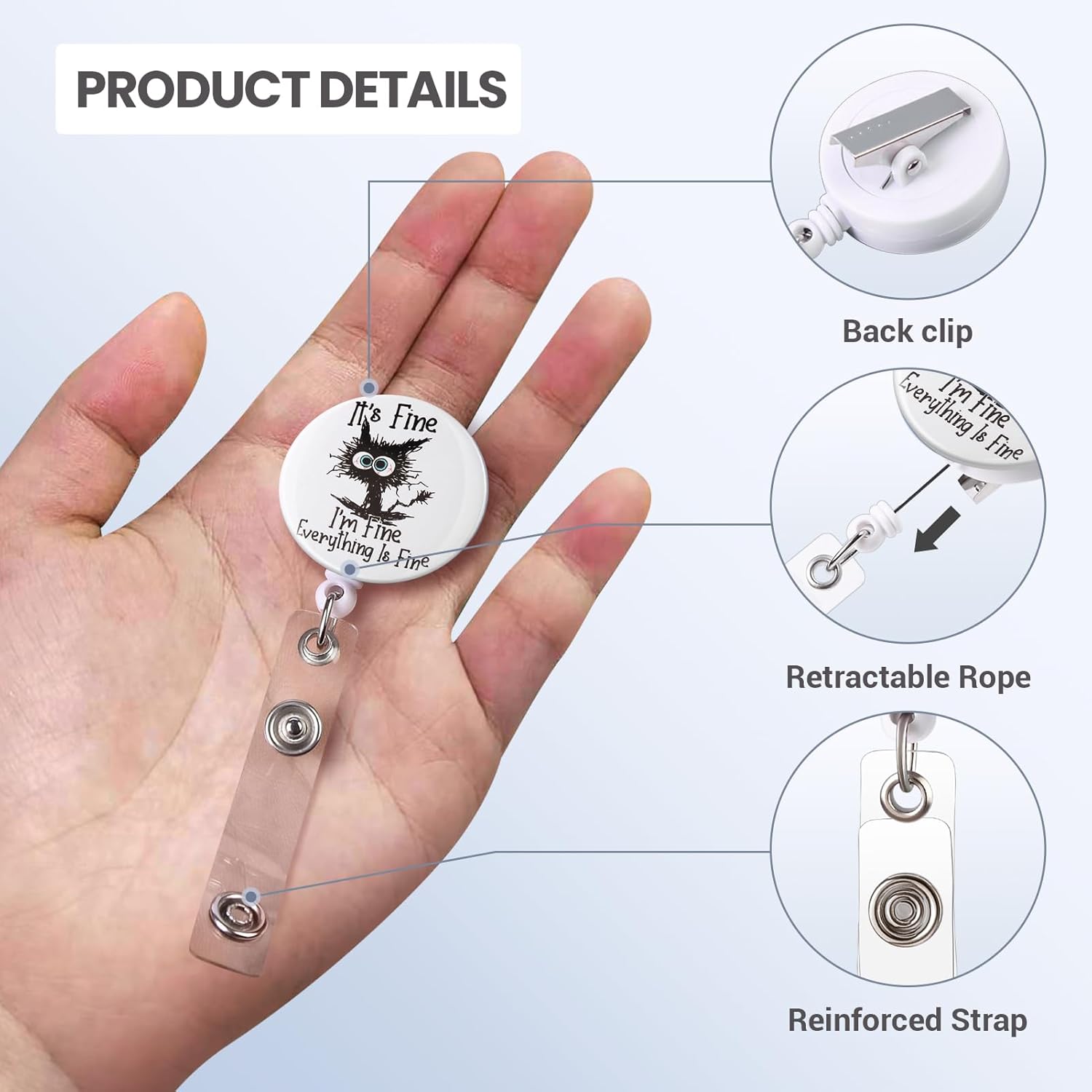 - Funny patterns and inspirational slogans can add fun to work. When you are irritated at work, you can take a look at your badge and say together I'm fine! The cute badge reel is full of personality and I hope it brings you a good mood while you're wearing it!