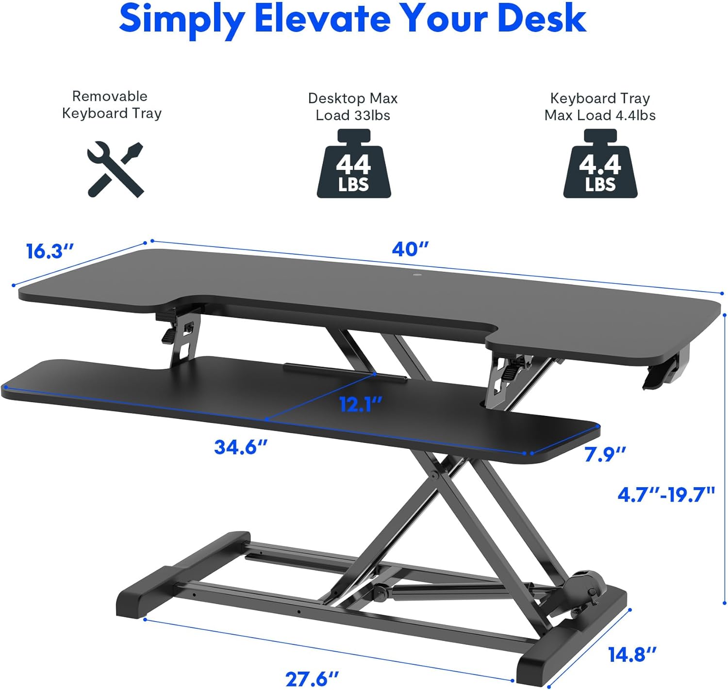 - Freely Height Adjustment: Go from sitting to standing with single-lever and allows a smooth height adjustment from 4.7'' to 19.7''. The powerful gas spring system holds up to 44 lbs while the keyboard tray holds up to 4.4lbs