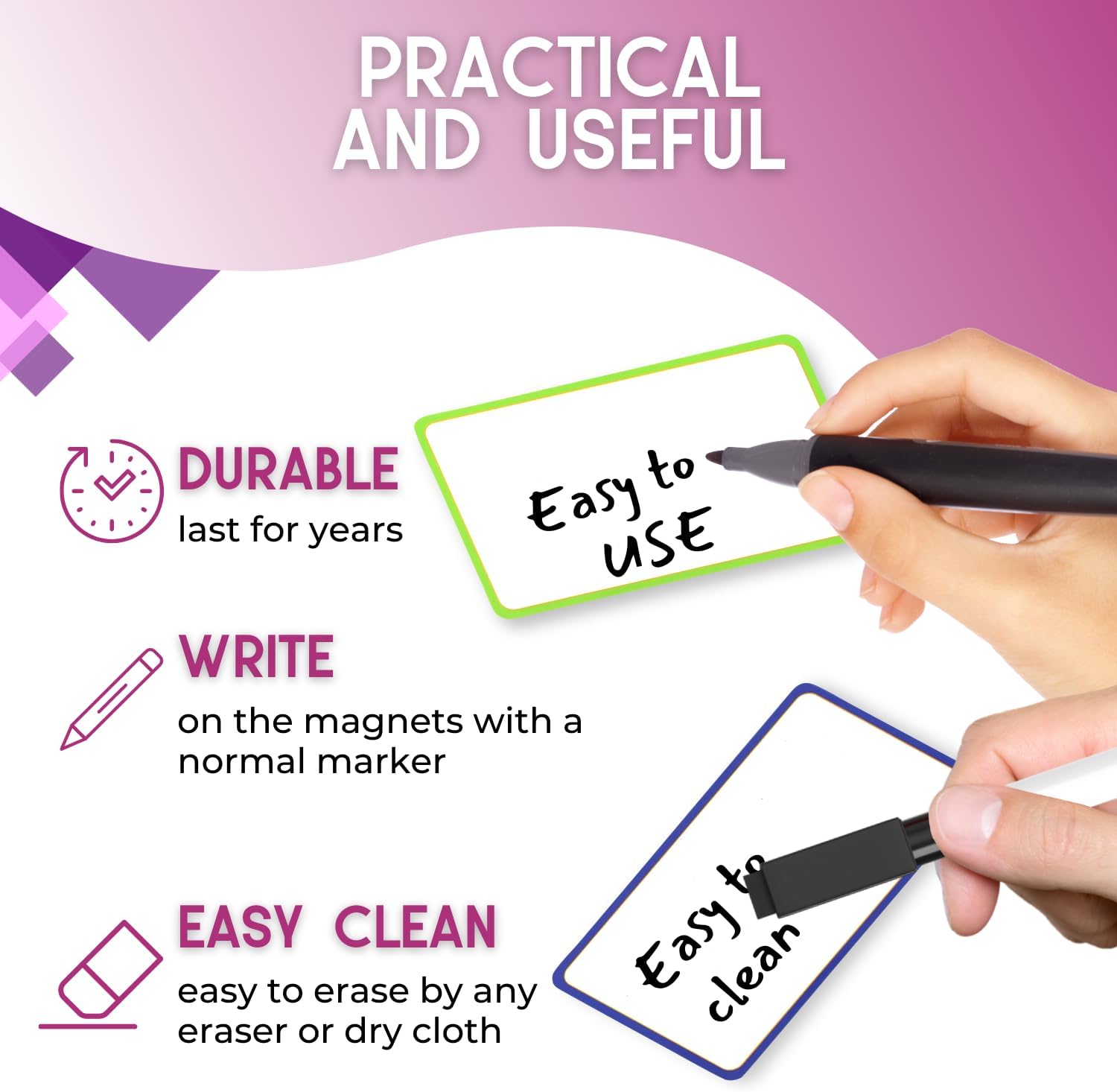 - High-quality Material: The magnetic dry-erase labels have a white writable front with a colored edge, made of laminated art paper, dry-erasable, and a 0.04 inches thickness strontium magnet, on the back for a powerful adhesion to various surfaces; Each label measures 5 x 3 inches;