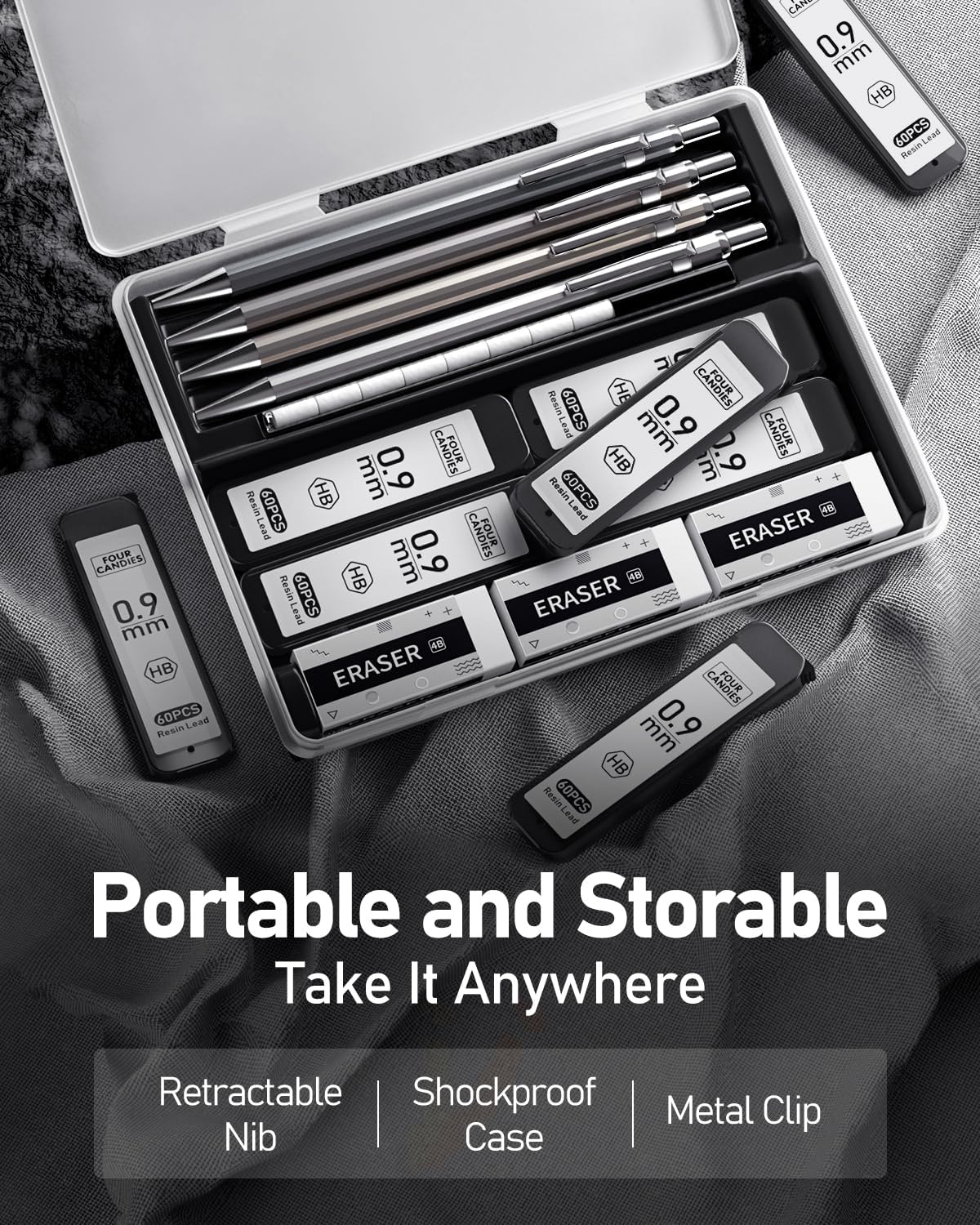 Four Candies 0.9mm Metal Mechanical Pencil Set with Case - 4PCS Fancy Mechanical Pencils, 8 Tubes HB #2 Lead Refills, 3PCS 4B Erasers and 9PCS Eraser Refills, Led Pencils Mechanical for Writing
