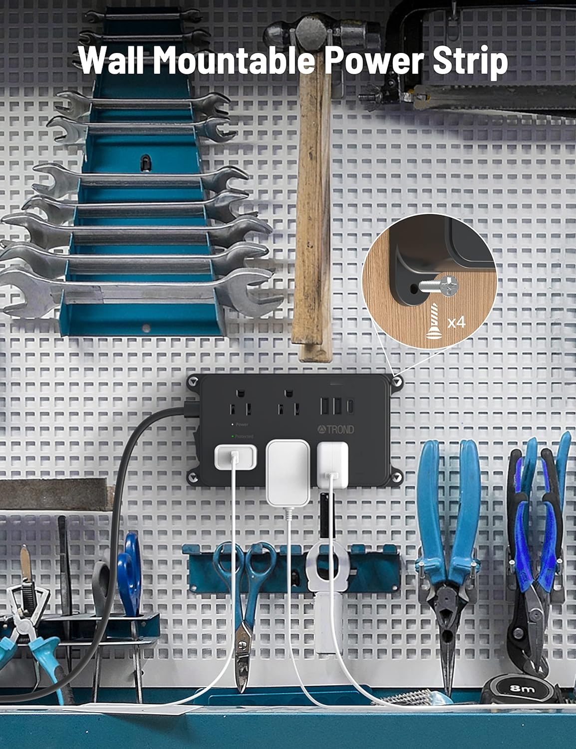 - Wall Mount Power Strip: This wall mountable power strip is a screw mountable design. Four screw-mounting tabs allow you to securely install this power strip and easily be reached, including behind the TV, workbench, garage, bedside, bathroom, laundry room, or under desk or cabinet, which is very low-profile and saves desktop space for you