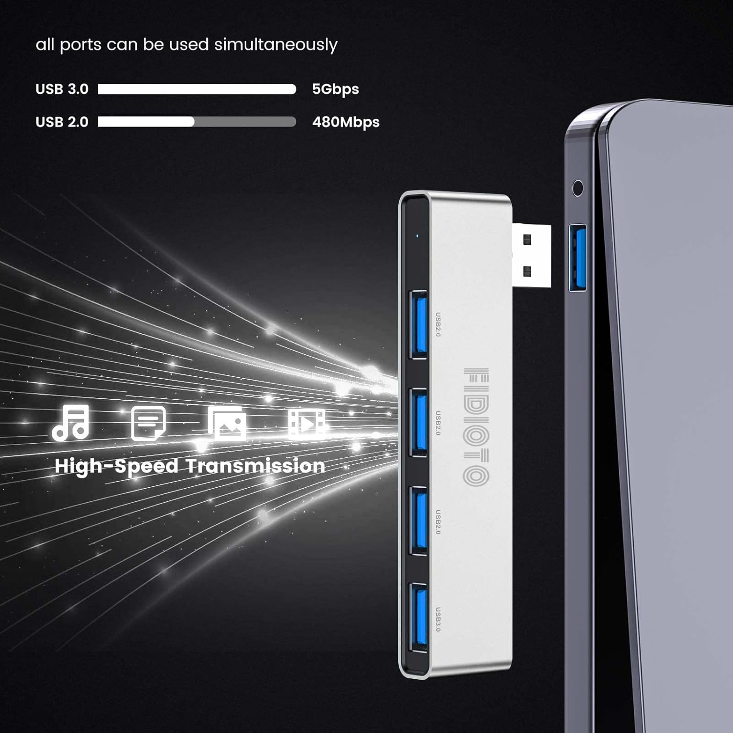 - Slim usb hub tansfer a single USB port into 4 USB data ports. you can get 1 USB 3.0 and 3 USB2.0 ports with your laptop. Support 4 ports to work at the same time, without any pressure, and keep the temperature in the middle range. Plug and play, no need driver, easy to use.