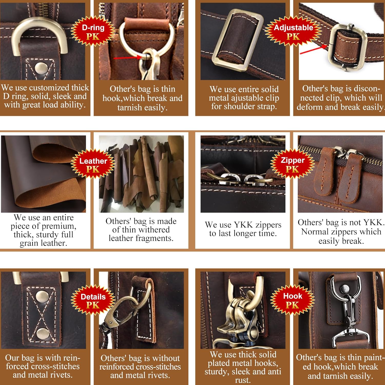 - 【ykk Zippers and Quality Accessories】ykk metal zippers closure with double sliders, which can bear 1000 times pull strength test, smooth and sturdy, keep your items safe in the brown leather briefcase. Heavy duty bronze metal hardware, thick tear-resistant lining, exquisite stitches and reinforced rivets by skilled artisans ensures longevity of the men' work bag. Comfortable leather pad on the handles can protect your hand from tear of long time carry