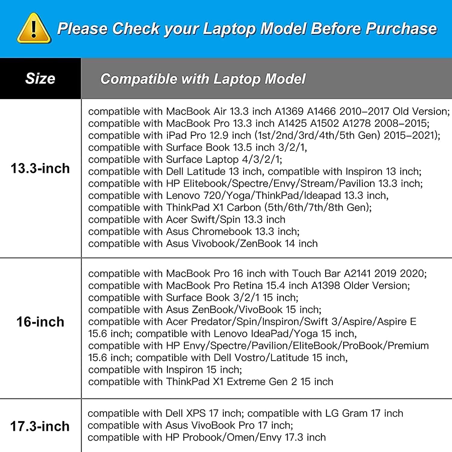 - Compatible with MacBook Air 15 inch M4 A3241 M3 A3114 M2 A2941 2025 2024 2023, compatible with MacBook Pro 16 2025-2019 M4 A3403 A3186 M3 A2991 M2 A2780 M1 A2485 A2141, compatible with MacBook Pro 15 A1990 A1707 A1398; Compatible with Surface Laptop 5/4/3 15, compatible with Surface Book 3/2/1 15; Compatible with Asus ZenBook/VivoBook 15; Compatible with Acer Swift 3/Swift 5/Aspire 3/5/7 15.6; Compatible with HP ProBook/Spectre x360/Envy x360 15.6; compatible with HP Omen/Pavilion x360 15.6.