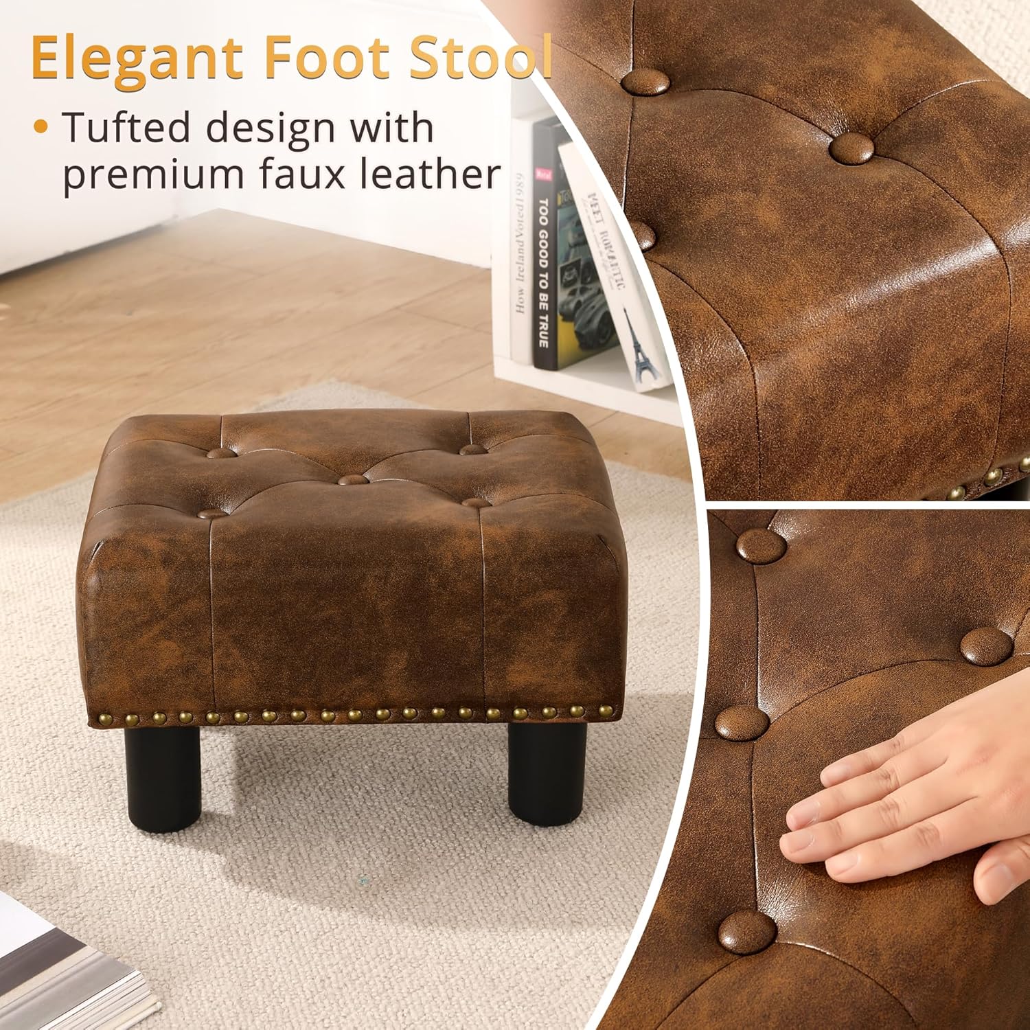 LUE BONA Small Tufted Foot Stool, Yellowish Brown Rivet Faux Leather Footrest with Plastic Legs, 9''H, Rectangle Foot Stools for Adult with Non-Slip Pads, Sofa Footstool for Living Room, Couch