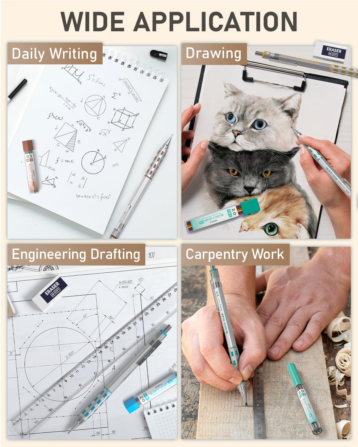 - Lots of Erasers & Sharpeners: Comes with 3 4B erasers and 1 kneaded eraser and 18 cap eraser refills. The kneaded eraser is suitable for cleaning and blending charcoal, pencils in drawing. 3 sharpeners for 2.0mm lead