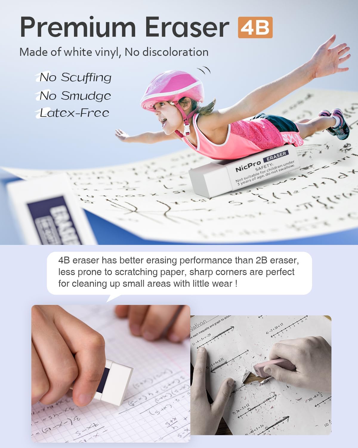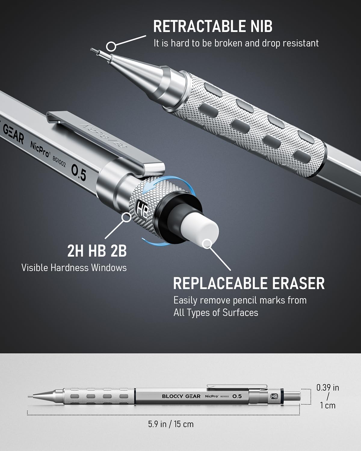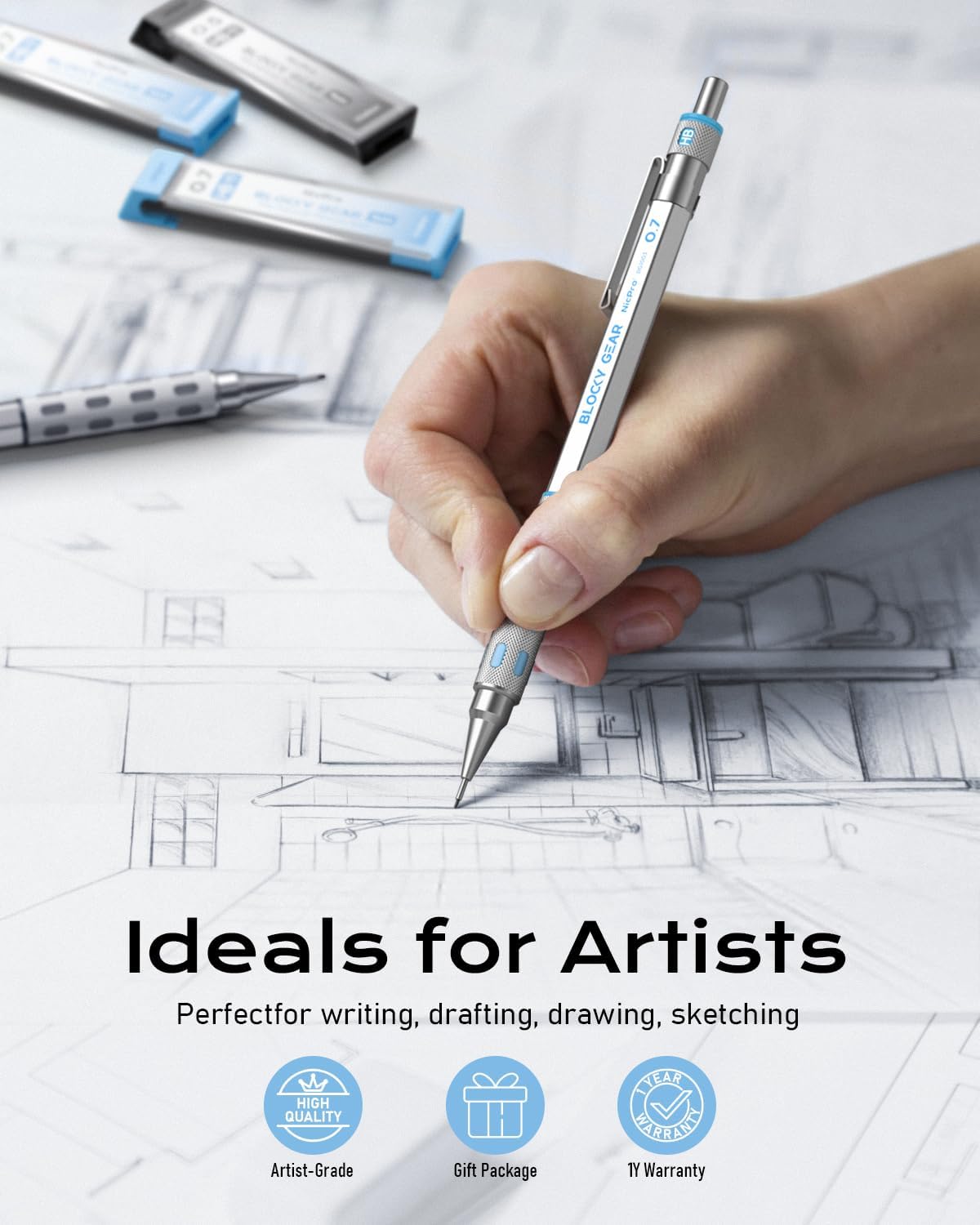 - Nicpro Blocky Gear:Come with 2PCS metal mechanical pencil in 05 mm and 0.7 mm, 6 tube of lead refills (HB &2B), 60pcs / tube, 2pcs 4B latex-free eraser, 18pcs replaceable cap erasers,all the stuff storage neatly in a case with flocking tray,what a gift for friends & family!Ideals for artists, professionals, teachers and students alike