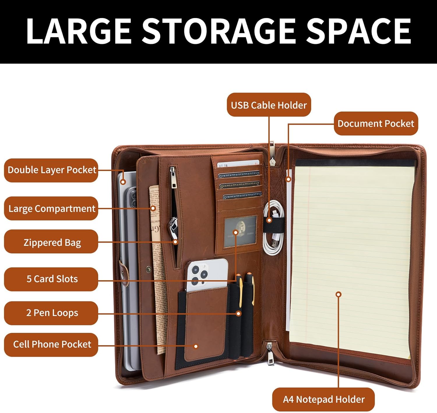 - Ultimate Organization Companion: Spacious compartments for documents. Inside YKK zippered pocket for secure storage. 5 convenient card slots, 2 pen loops for quick access, a dedicated cell phone pocket, and even a USB cable holder. Stay impeccably organized and make a powerful statement in any business setting.