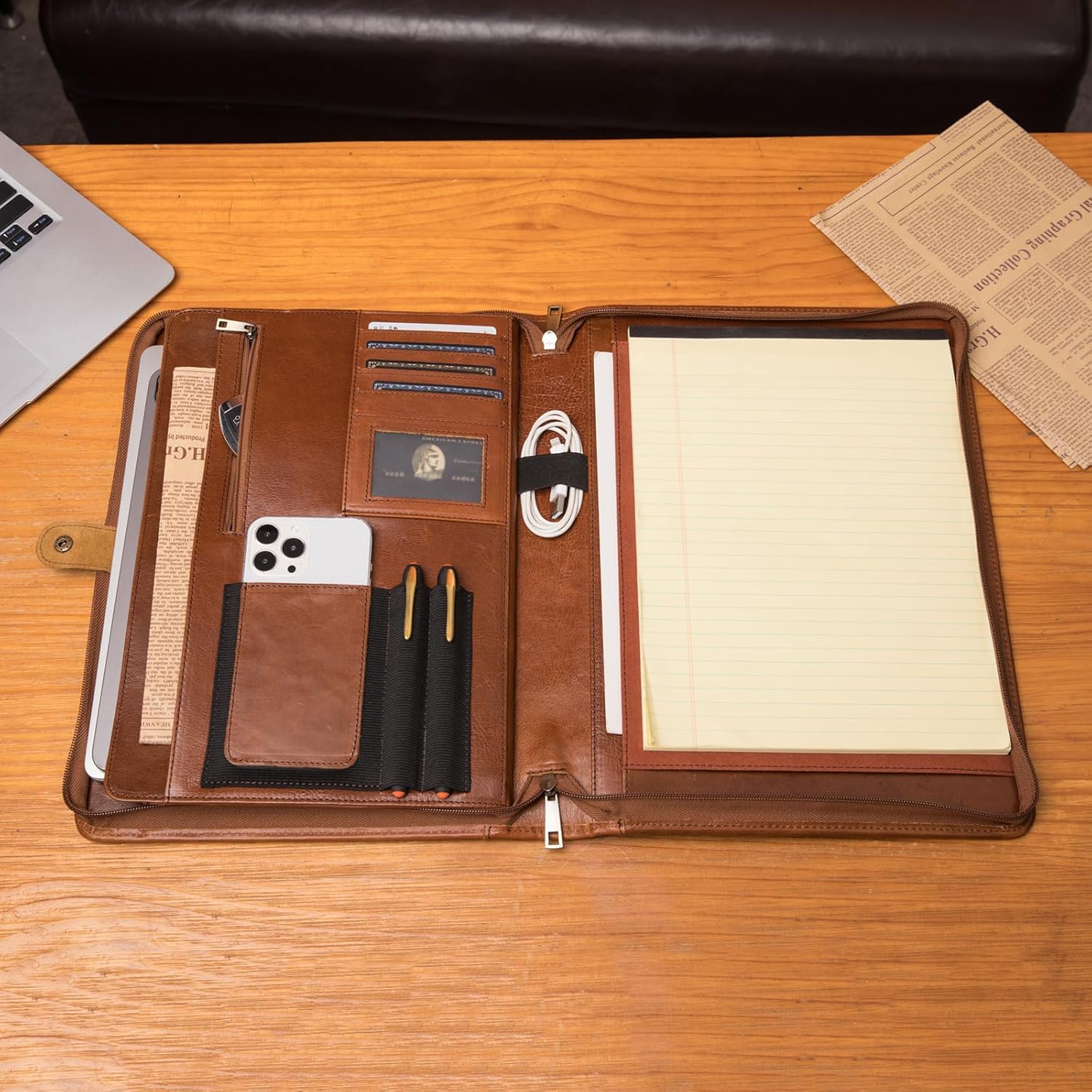 Genuine Leather Portfolio, Legal Size 8.5 x 14 Pad Holder, Business Padfolio for Men and Women, Zippered Laptop Organizer, Executive Professional Work Travel Notepad Folio, Brown, Oil Tanned