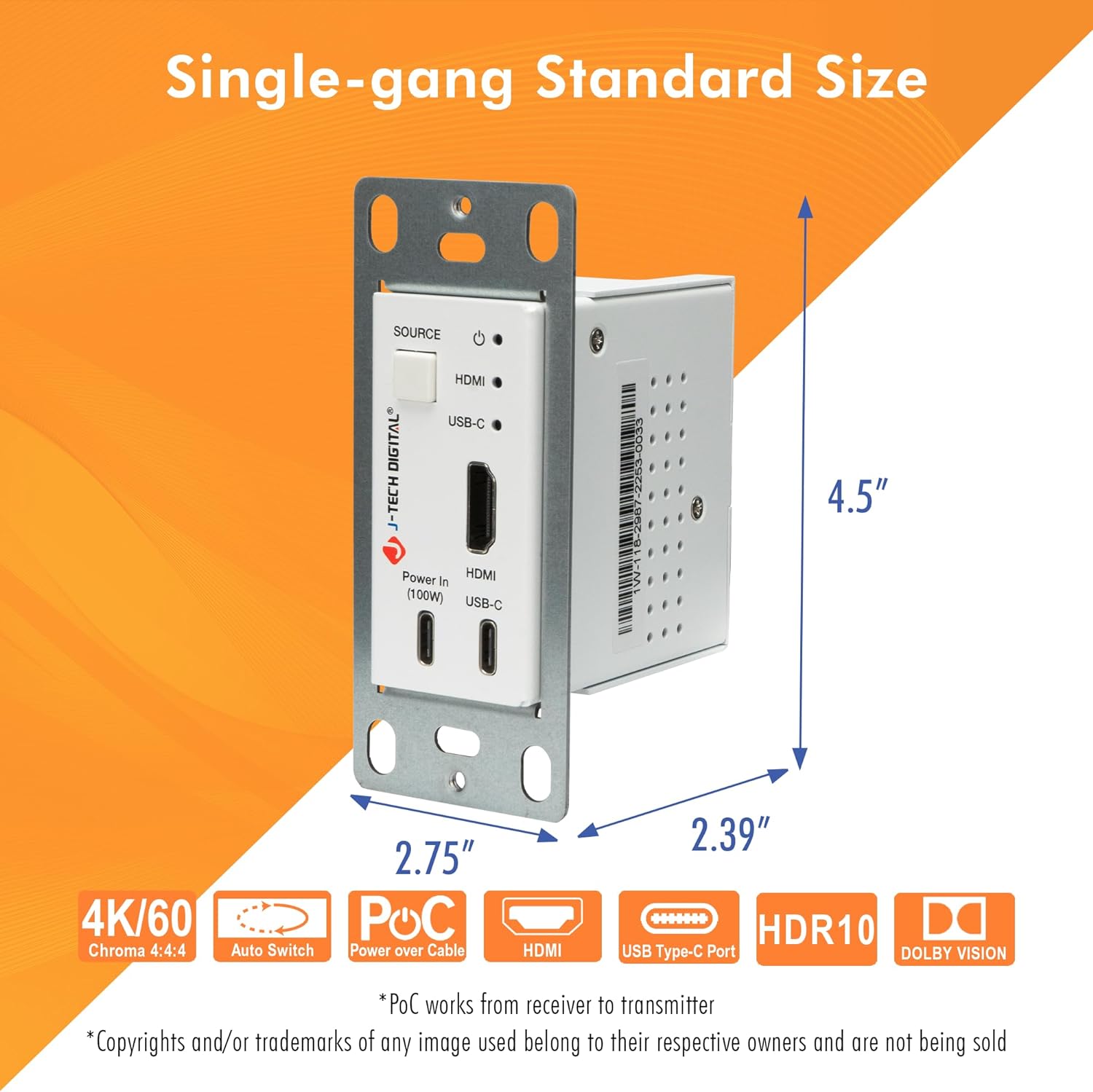J-Tech Digital 4K HDMI & USB C Extender Over Single Cat5 5e 6 7 Cable, Up to 164ft Wall Plate Over Ethernet HDR Dolby Vision USB-C Charging Port, PoC, IR, Auto-Switch [JTECH-EXW30]