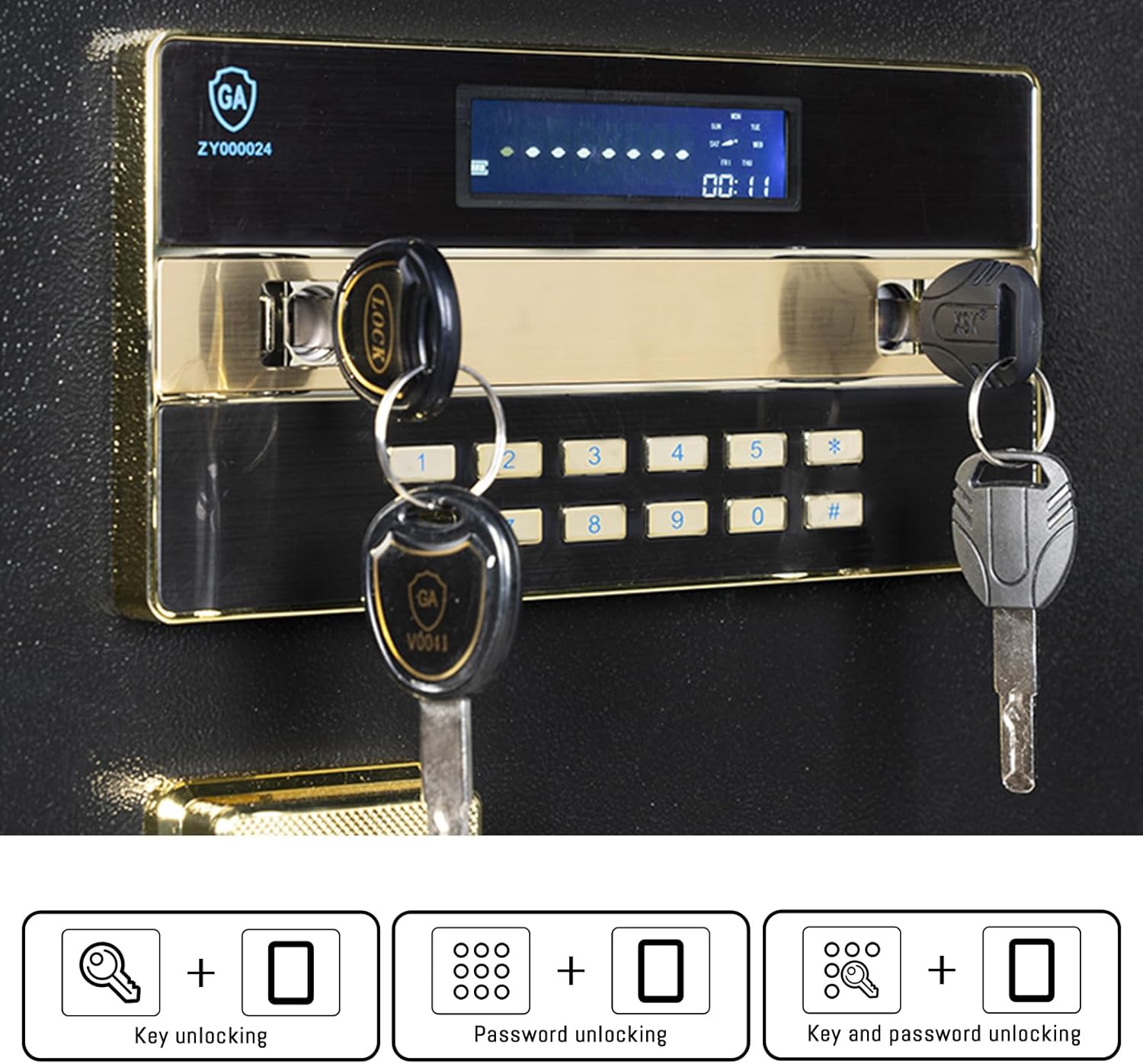 - [Unlocking Method] ①Main key + Auxiliary key+emergency key(first use, battery is out of power)②Main key+Auxiliary key+fingerprint ③Main key+Auxiliary key+password ④Fingerprint + password + Main key+Auxiliary key(safe mode) ⑤Fingerprint/Password Only(After pulling out main key and auxiliary key horizontally)Main key+Auxiliary key(safe mode) ⑤Fingerprint/Password Only(After pulling out main key and auxiliary key horizontally)