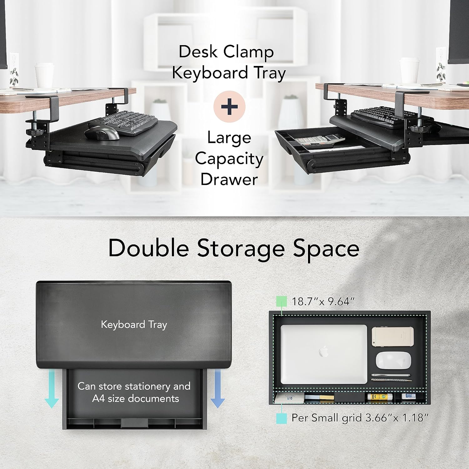 EHO Keyboard Tray with Drawer - Clamp On Under Desk Pull Out Extender Table Attachment Platform with Storage Organizer, Large 27.5" (31.8" Including Clamps) x 12.2", Height Adjustable for Home Office