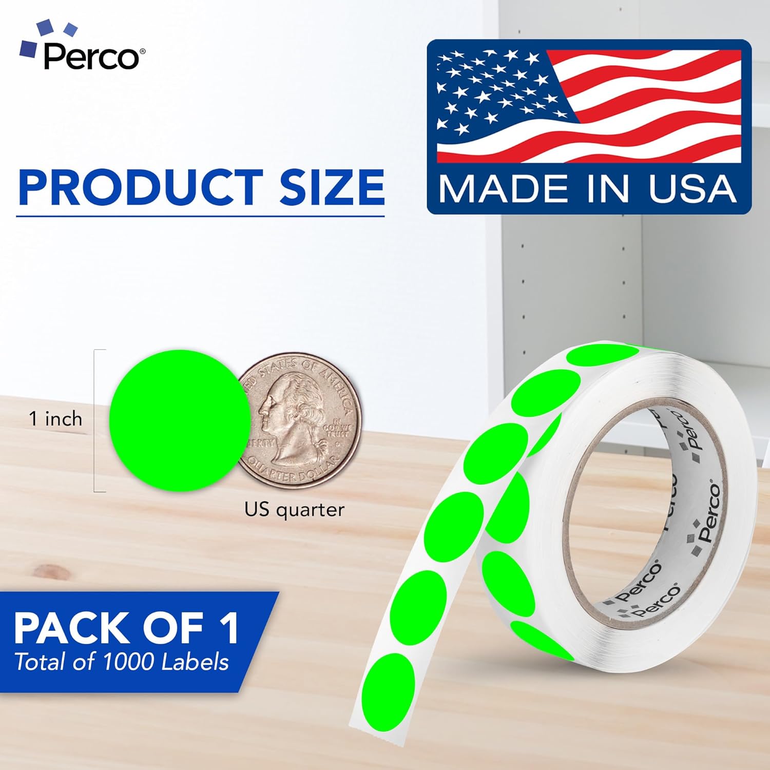 Perco Fluorescent Green 1-Inch Round Circle Dot Sticker Labels with Easy Peel Perforation - 1,000 Labels per Roll - Strong Adhesion, Vibrant Colors for Organizing, Crafting & More - Made in USA